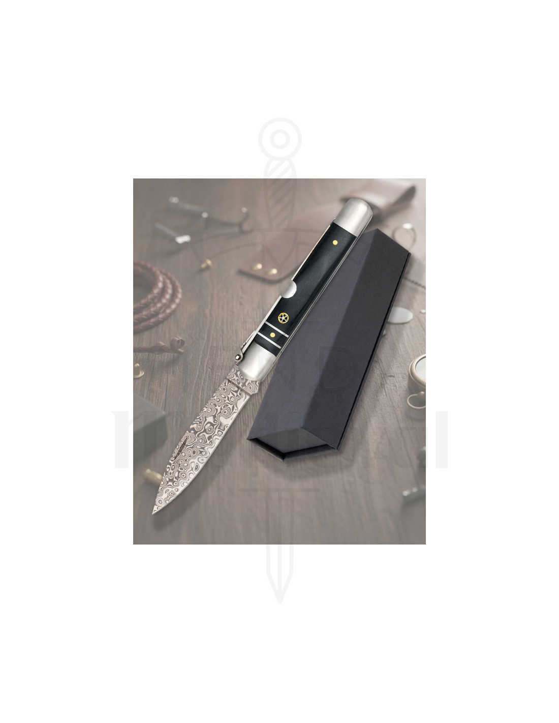 The damascus steel blade, with its characteristic pattern, not only provides a unique aesthetic but also guarantees durability and a sharp edge that facilitates precise cuts effortlessly, enhancing the practical experience in demanding and everyday tasks. Its layered structure translates into resistance for prolonged use and a finish that ages with character.