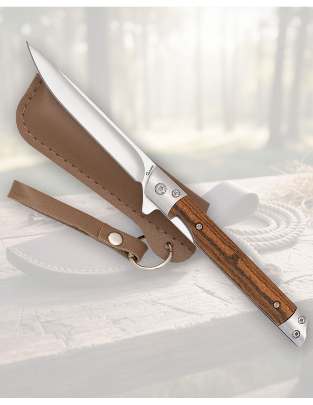 The brown faux leather sheath, with visible seams, a metal ring, and a button strap, makes it easy to carry the knife attached to your belt or stylishly hung, keeping it protected and accessible. It comes presented in a colored box, ready for gifting or safe storage.