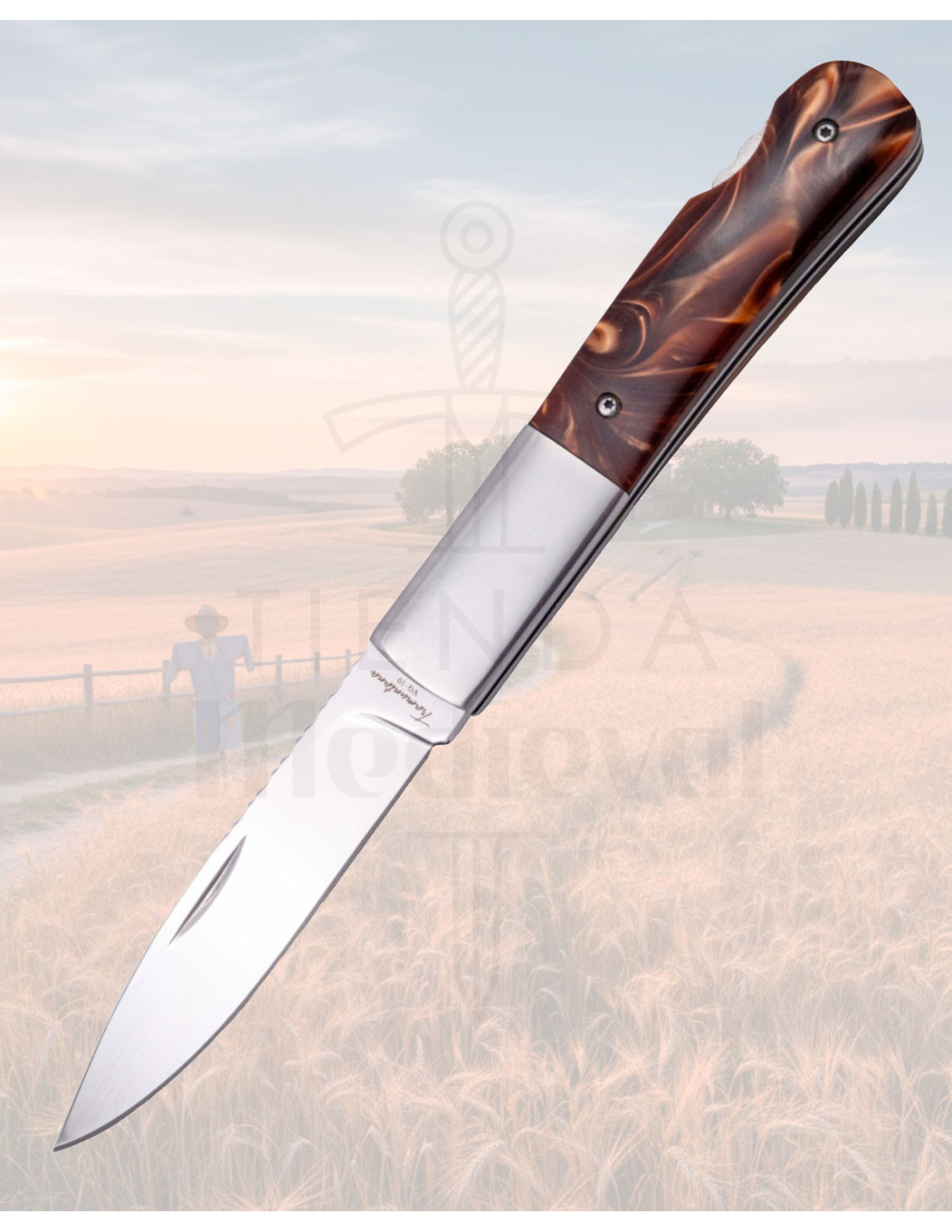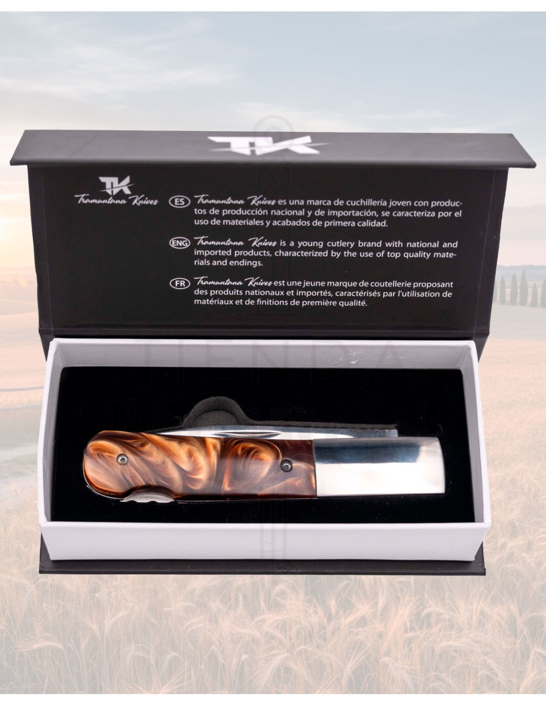 Designed for those who value the balance between aesthetics and functionality, the Tramuntana Knife 10.2cm, VG10 with back lock offers precise and comfortable handling thanks to its warm veined handle that mimics wood, finished in amber acrylic with visible rivets conveying solidity. The polished steel bolsters provide an elegant contrast and facilitate finger grip, for controlled cuts without effort.