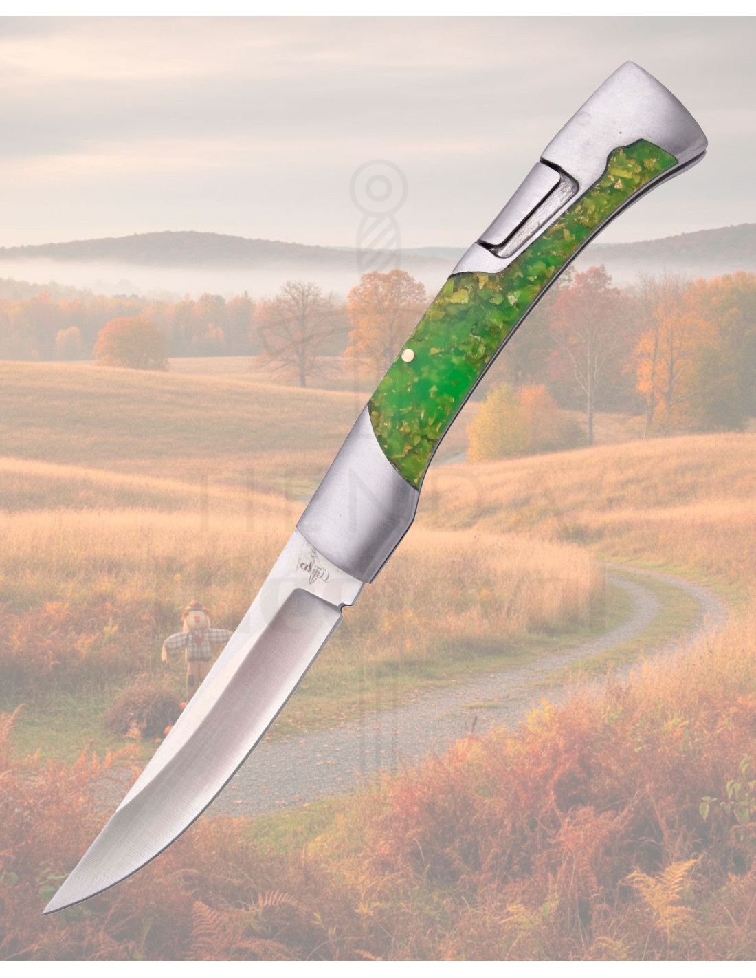 The blend of polished steel and irregular patterned acrylic handle offers more than just style; it ensures quick visibility and a firm grip for precise cuts. The 440 steel blade with a satin finish is designed to maintain a reliable edge, respond accurately to demanding tasks, and withstand everyday wear and tear.