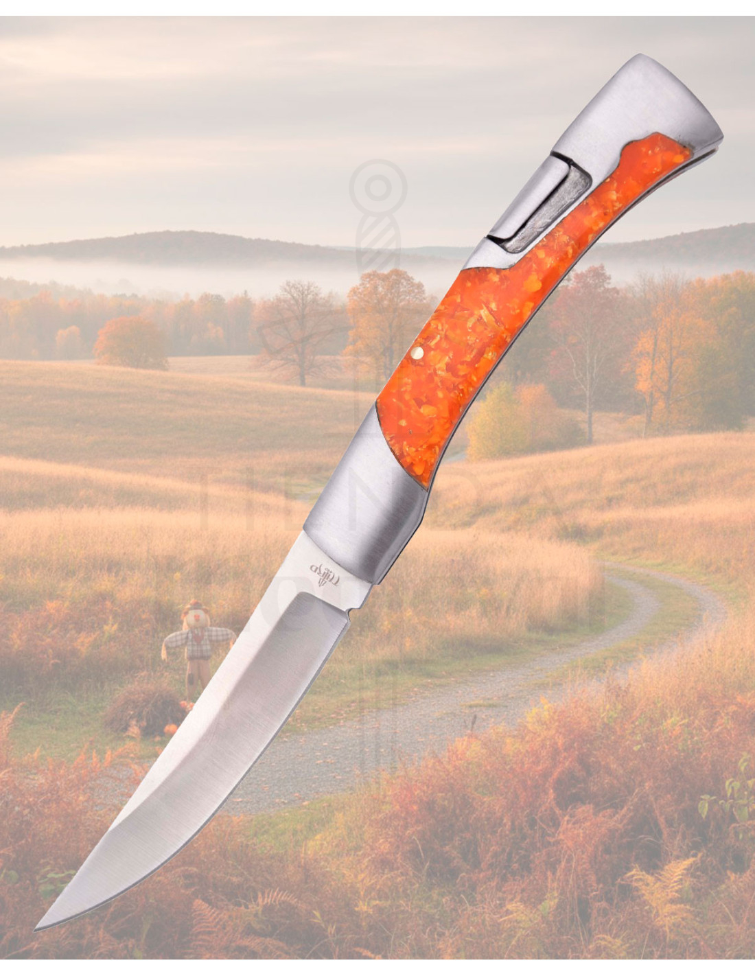 The handle combines steel and a fluorescent orange acrylic insert with marble-like veins, making it easy to find even in low light. Its curved design ergonomically hugs the hand, providing a secure grip and a prolonged sense of control, while the polished metal bolsters reinforce the durability and premium look.