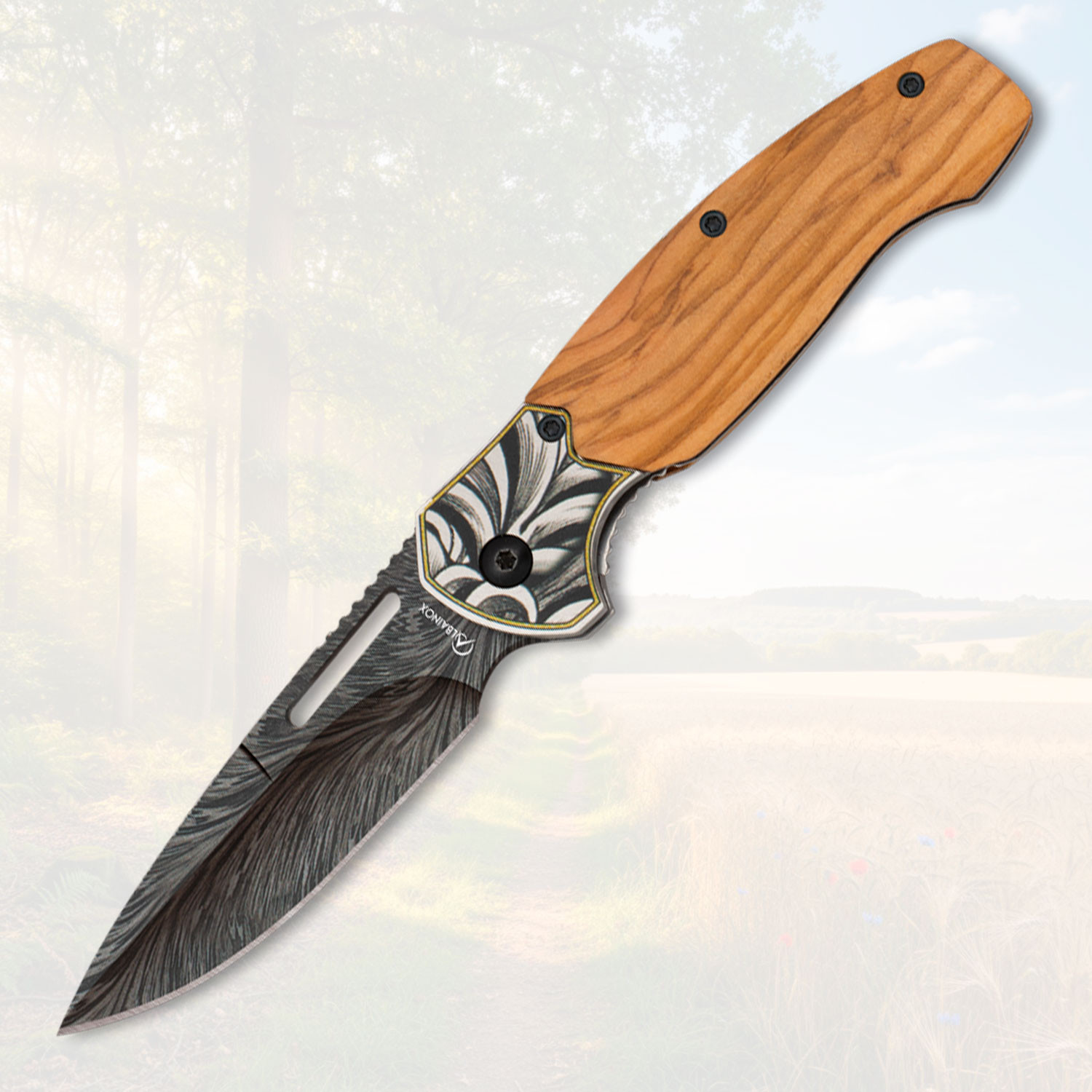 Imagine opening a small treasure that combines design and functionality in every detail, and feel pride in carrying it; that is the experience offered by this piece. The blade features a dark decorative finish with a wavy pattern that gives it personality, while the contrast between the ornate front section and the light wood of the handle brings warmth and elegance to the grip.