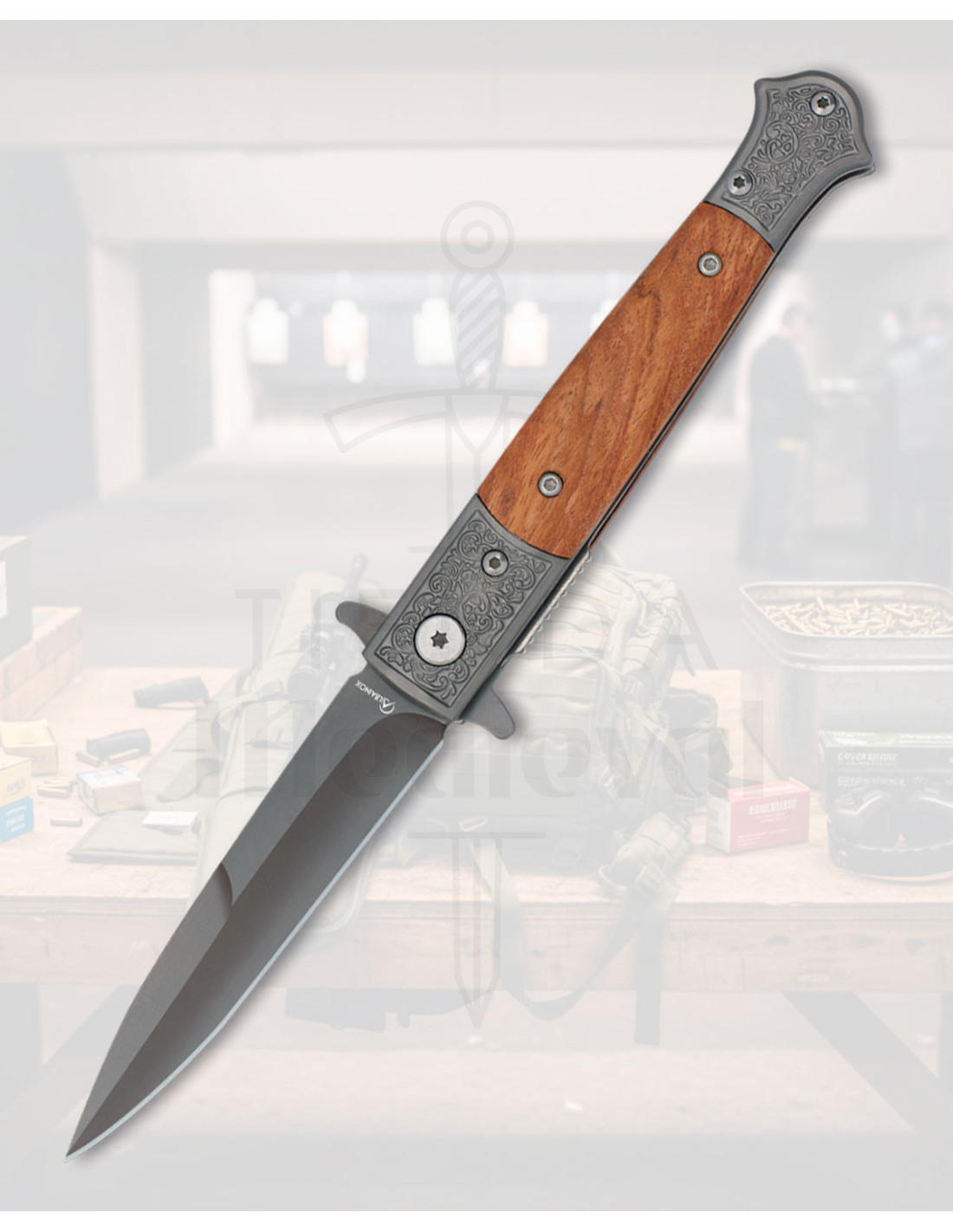 The matte finish of the blade and its beveled tip not only offer a sober aesthetic but also translate into precise cuts without uncomfortable reflections, perfect when you need discretion and efficiency. The machined detail at the base of the blade with a visible screw and ornamental relief adds character, as well as showcasing a careful construction that speaks of durability and style.