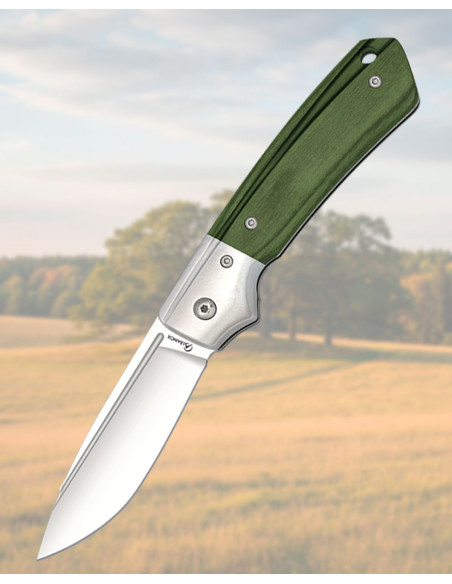 The handle in green with visible grains not only stands out for its aesthetics but also adapts to the hand to offer a stable and comfortable grip, preventing slips and facilitating maneuvers. The exposed screws reinforce the perception of robustness, and the hole at the pommel allows you to add a cord to carry it hanging or secure it to your gear.