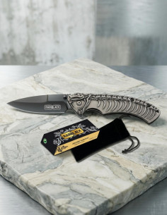 Imagine having in your hands a symbol of determination, an object that, beyond its utility, becomes an extension of your personality. With a 7.80 cm blade made of stainless steel, its straight edge and sharp point are always ready to act with precision. The handle, with its embossed bone-like pattern and metallic gray details, not only provides a firm grip but also reinforces that sensation of absolute control. Safety and ease of use are solidified with a liner lock system and a clip for easy portability, along with the black fabric sheath that accompanies the set. The decorative box, featuring touches of black, beige, and yellow, reinforces the perception of an object designed for those who want the best in every move, a piece that speaks directly to your leadership and confidence.