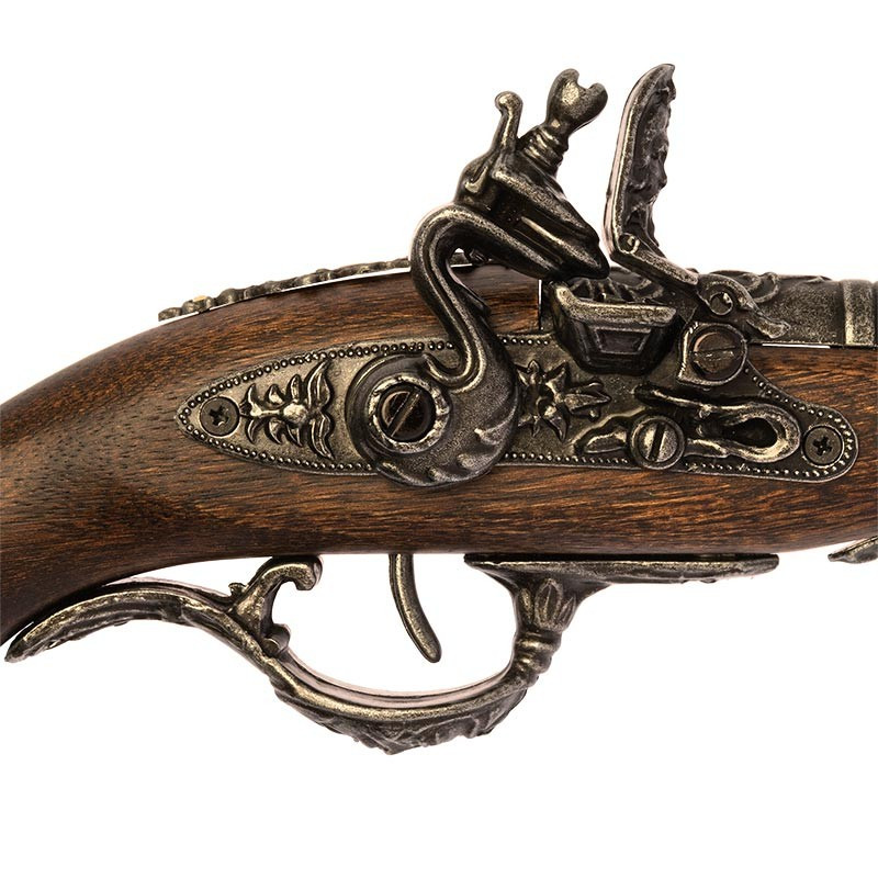 With a length of 31 cm and a weight of 460 grams, this Terzetta pistol is not only impressive for its authenticity and detail, but also for its comfortable and balanced handling, making it a standout piece for collectors and military history buffs. Made entirely of high-quality wood, with a barrel and mounts in burnished cast metal, this replica is a work of art in itself. Engravings with floral motifs add a touch of elegance and refinement, highlighting the skill and art of 18th century gunsmiths.