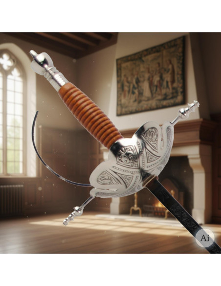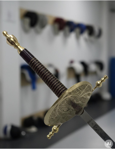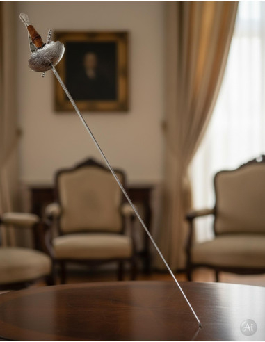 The most distinctive visual element is its cup-shaped guard, whose metallic texture and nickel-plated fittings provide a cold and sophisticated shine. The handle, designed with an ergonomics that evokes a professional grip, blends into the crossguard in a union of clean lines and visual balance. This ornamental piece not only decorates a space; it evokes the agility and honor of the piste in every reflection of its handcrafted steel.