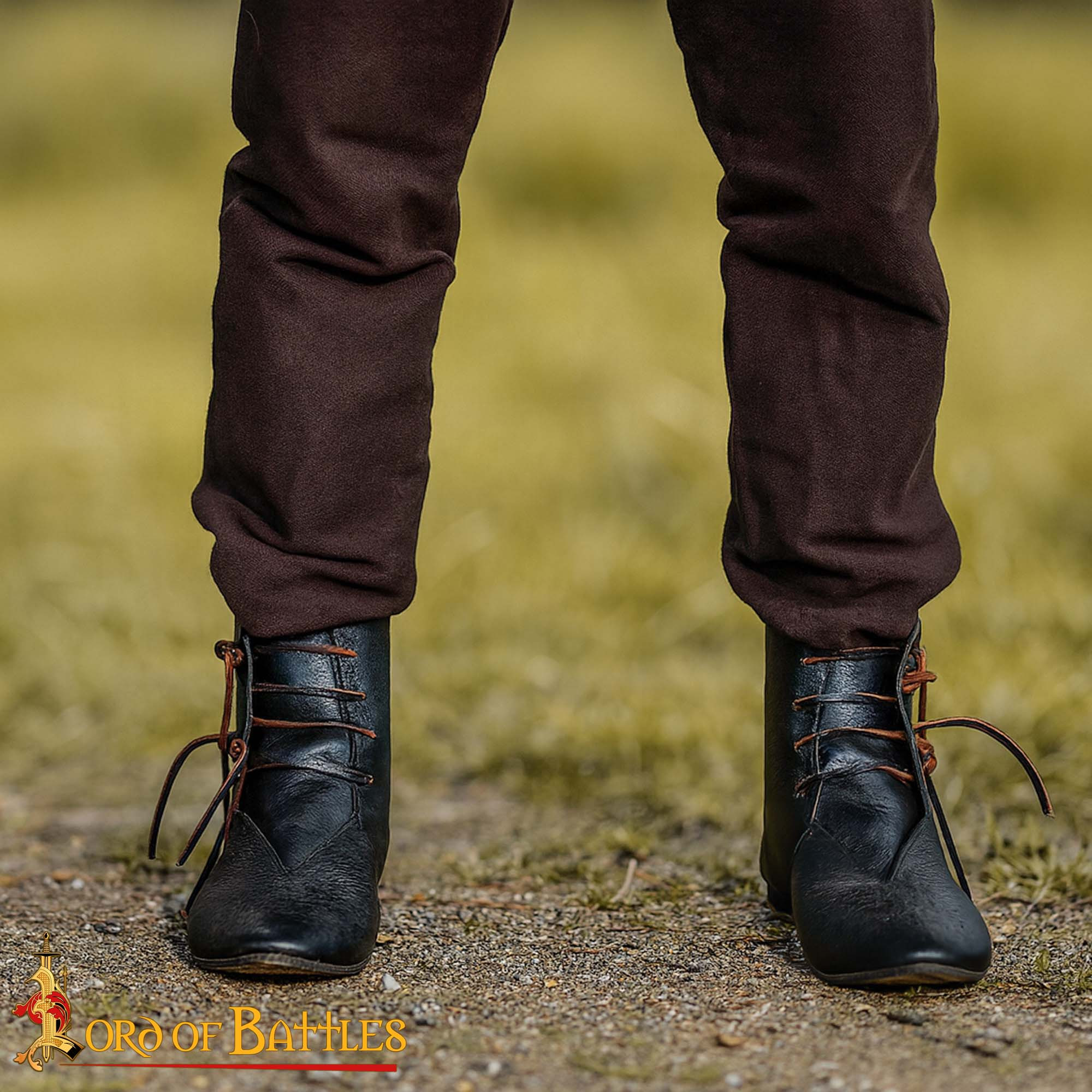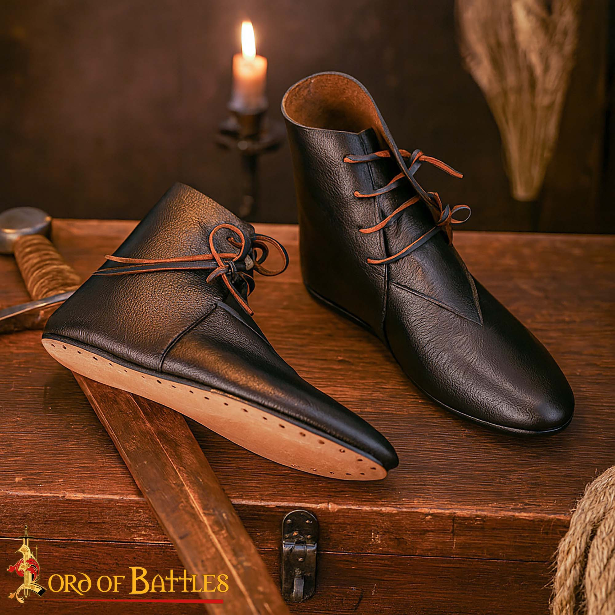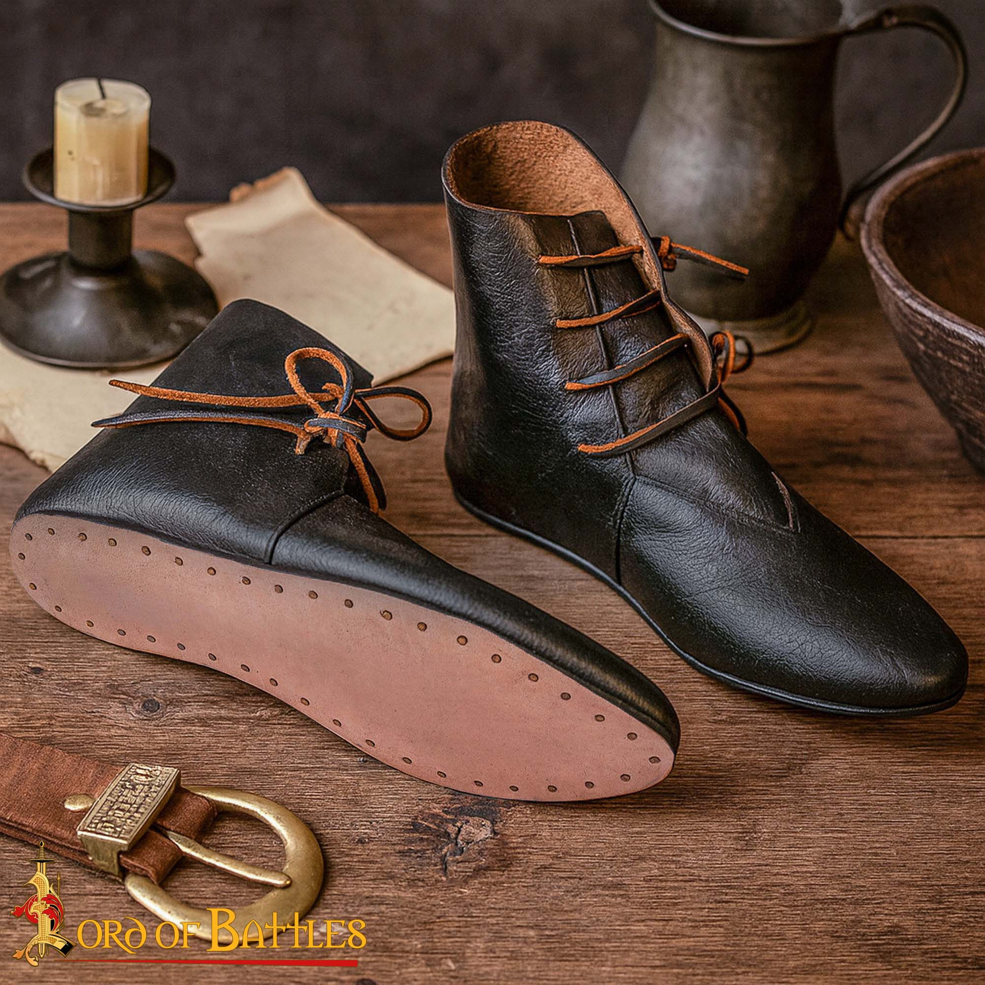 Useful keywords when deciding: buy Medieval Black Leather Ankle Boots with Side Laces, buy Medieval Black Leather Ankle Boots with Side Laces for historical reenactment, sale of Medieval Black Leather Ankle Boots with Side Laces. This pair turns your outfit into a faithful, comfortable representation ready for action.