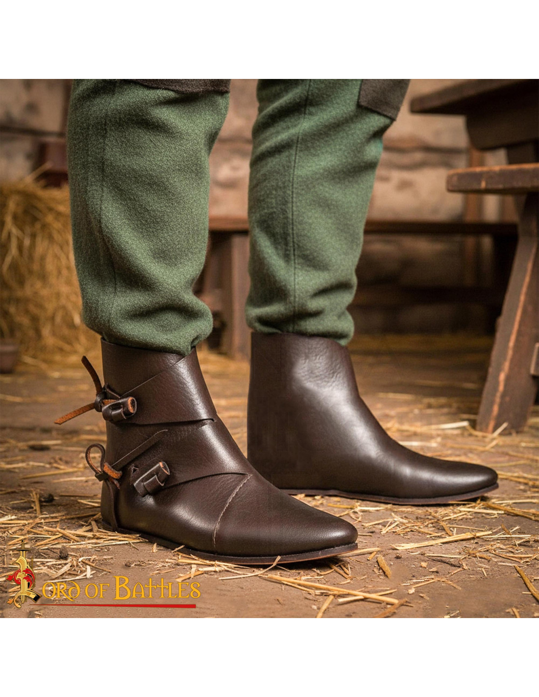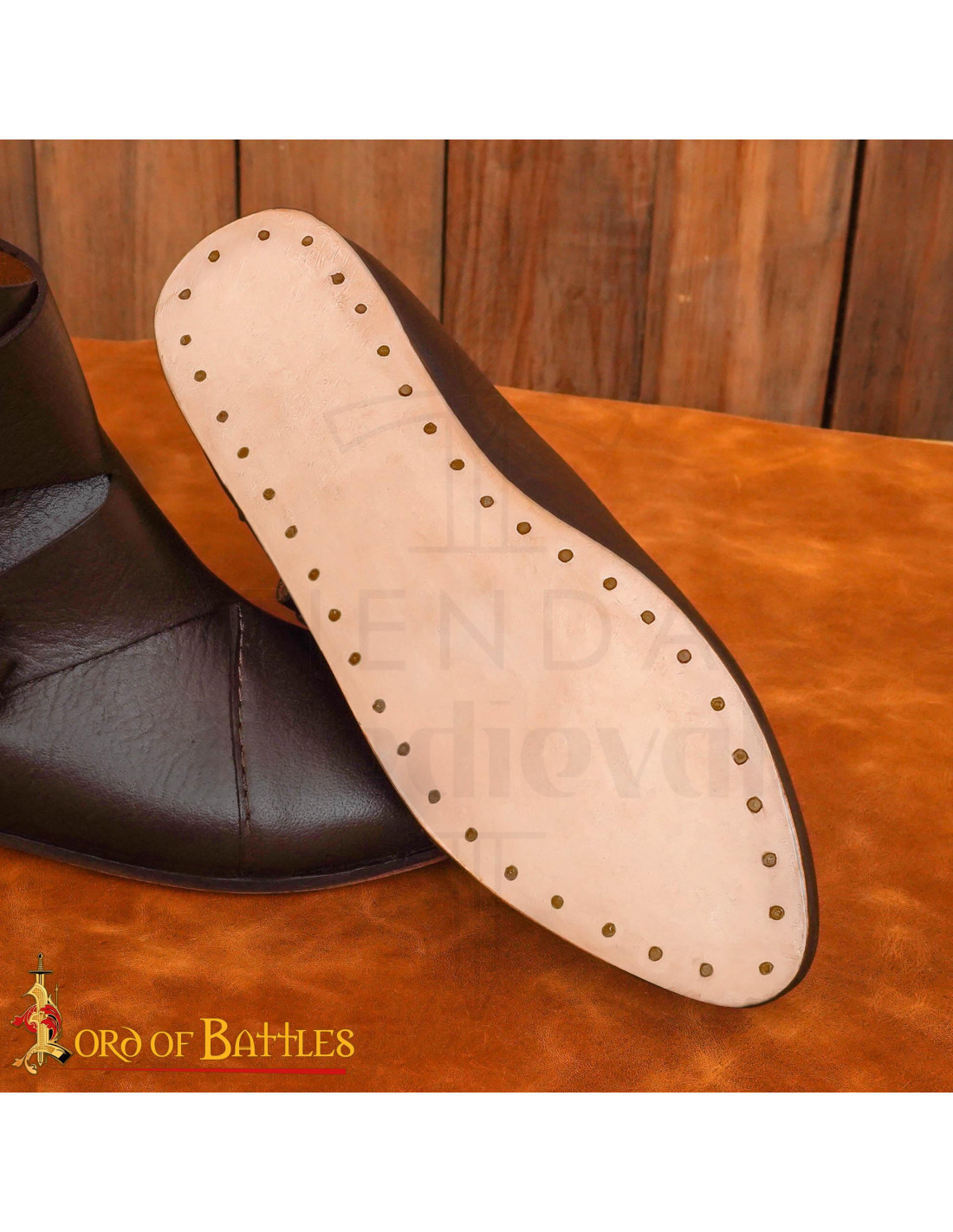 The low ankle shaft and slightly pointed toe allow freedom of movement, ideal for agile travel without sacrificing a historical appearance. The light-colored interior and unpretentious finish convey visual authenticity, while the flat leather sole provides that natural ground contact feel, perfect for dirt paths, forests, and medieval fair environments.