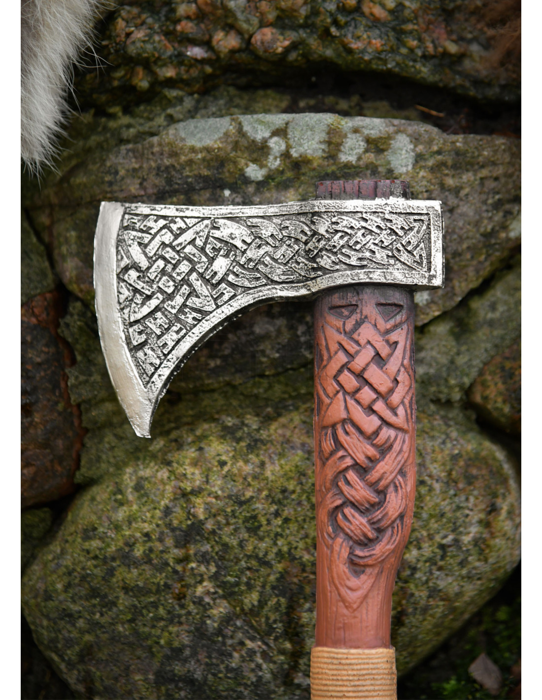 Ulfric is not just another accessory, it is a statement: its silver head with an aged finish and the intertwined geometric engravings provide an astonishingly authentic look that turns every gesture into a believable photo or scene. The smooth edge maintains a clean aesthetic, while the foam construction offers a steel appearance without compromising the necessary safety for skirmishes and performances.