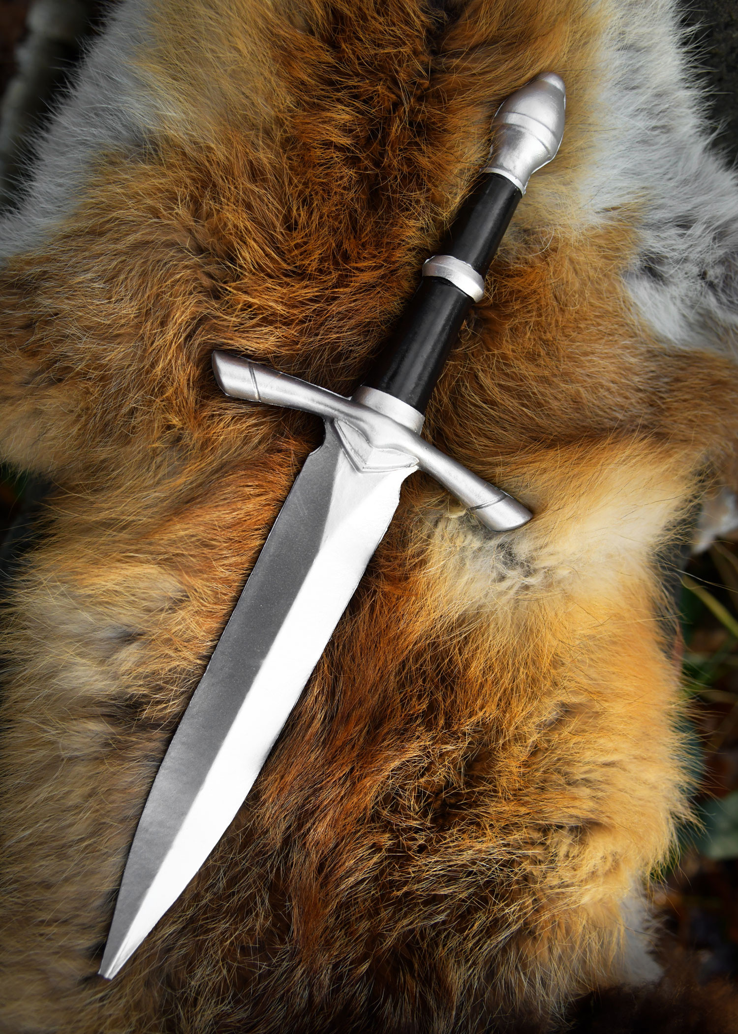 The curved guard protects the hand and adds a classic silhouette that fits a multitude of characters, from the stealthy spy to the knight defending honor, encompassing the assassin acting from the dark corner. The ergonomic grip, separated in sections by silver rings, ensures a firm hold even during intense confrontations, and the rounded pommel helps balance each movement, so every gesture feels natural and secure.