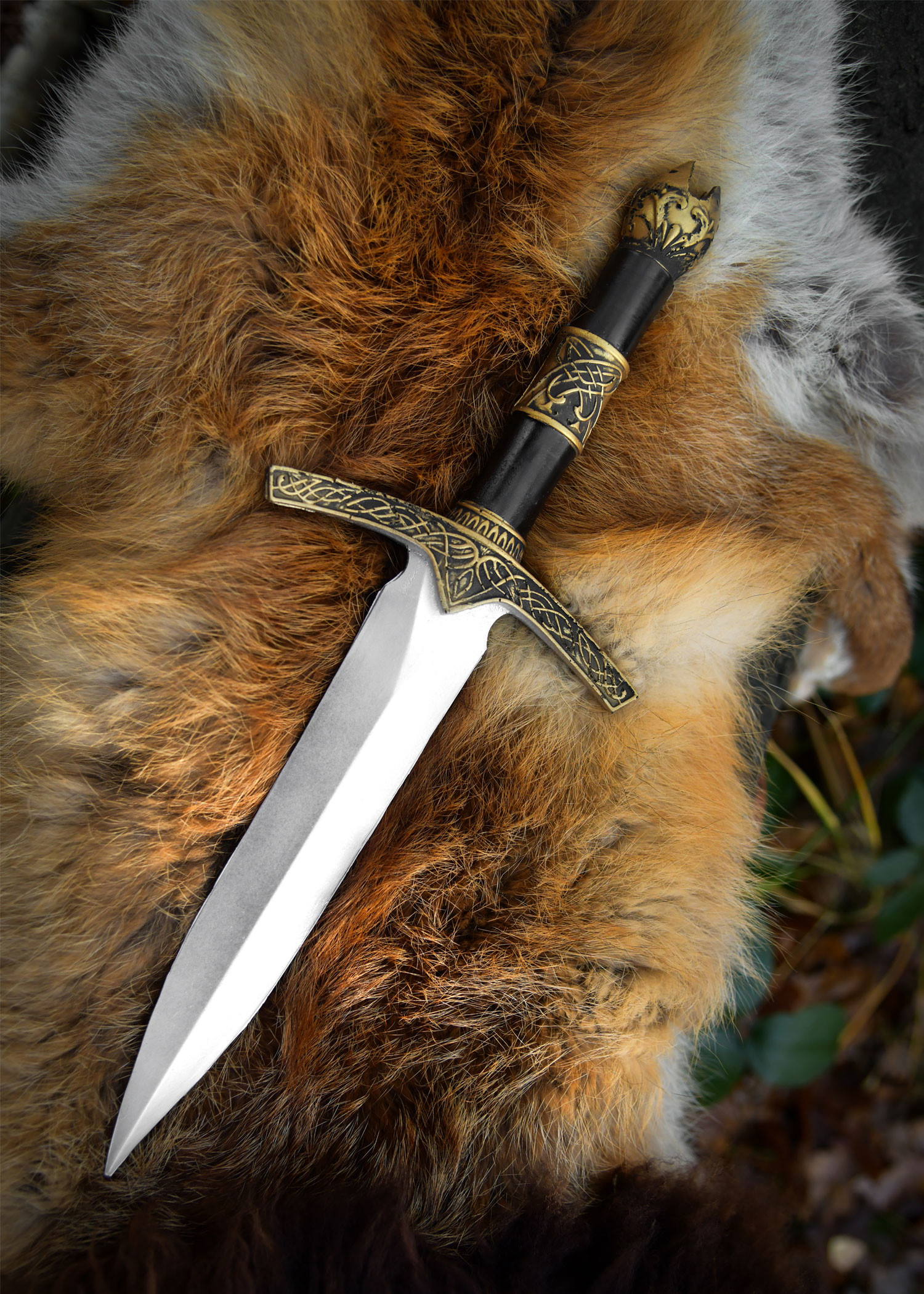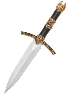 The guard in aged golden tone, richly ornamented, and the black handle with engraved golden rings, provide a visual focal point that complements any costume, from a wizard’s tunic to a knight’s cloak. The pommel shaped to evoke a crown or stylized flower adds an elegant finishing touch, ideal for those who pay attention to every detail of their outfit.