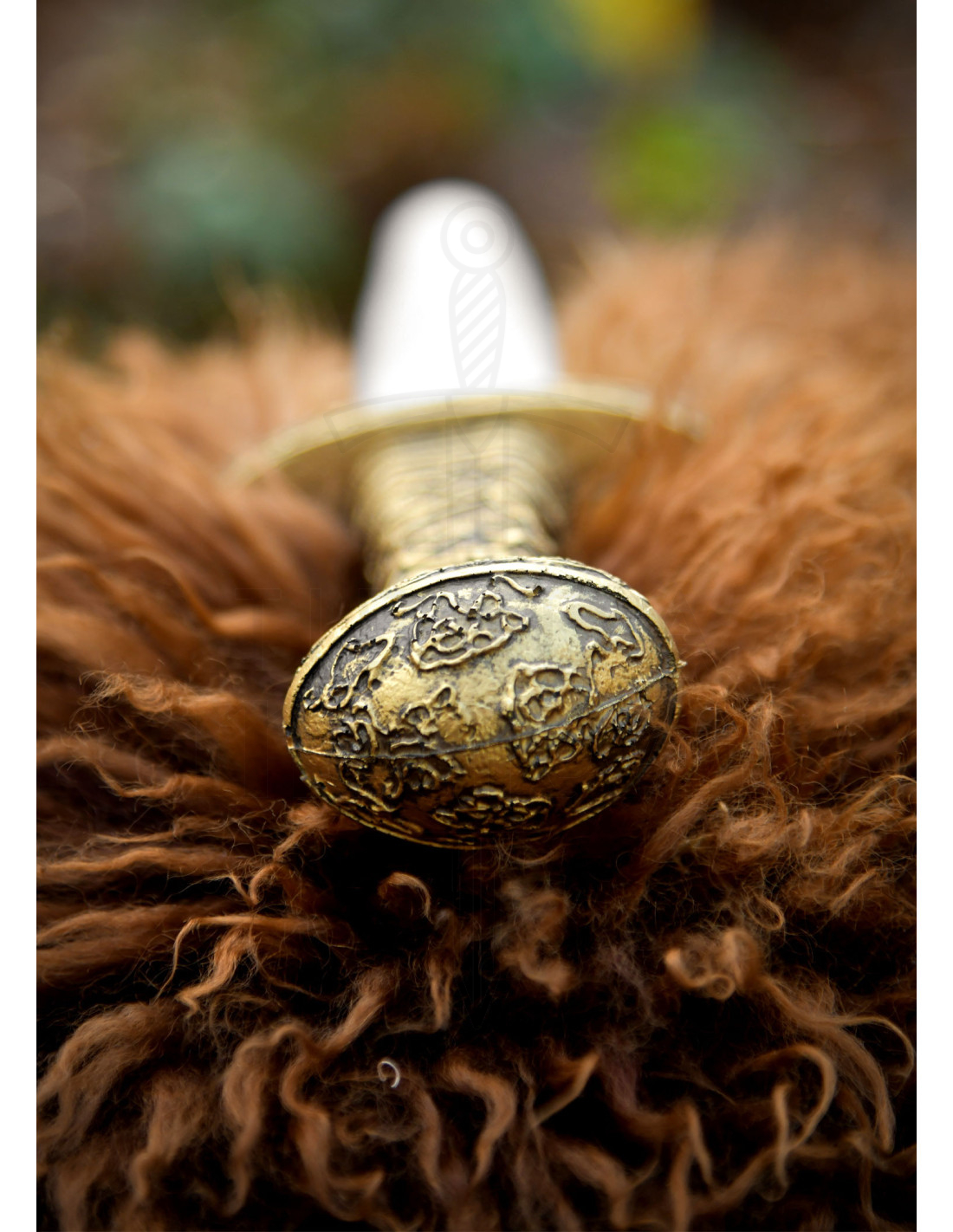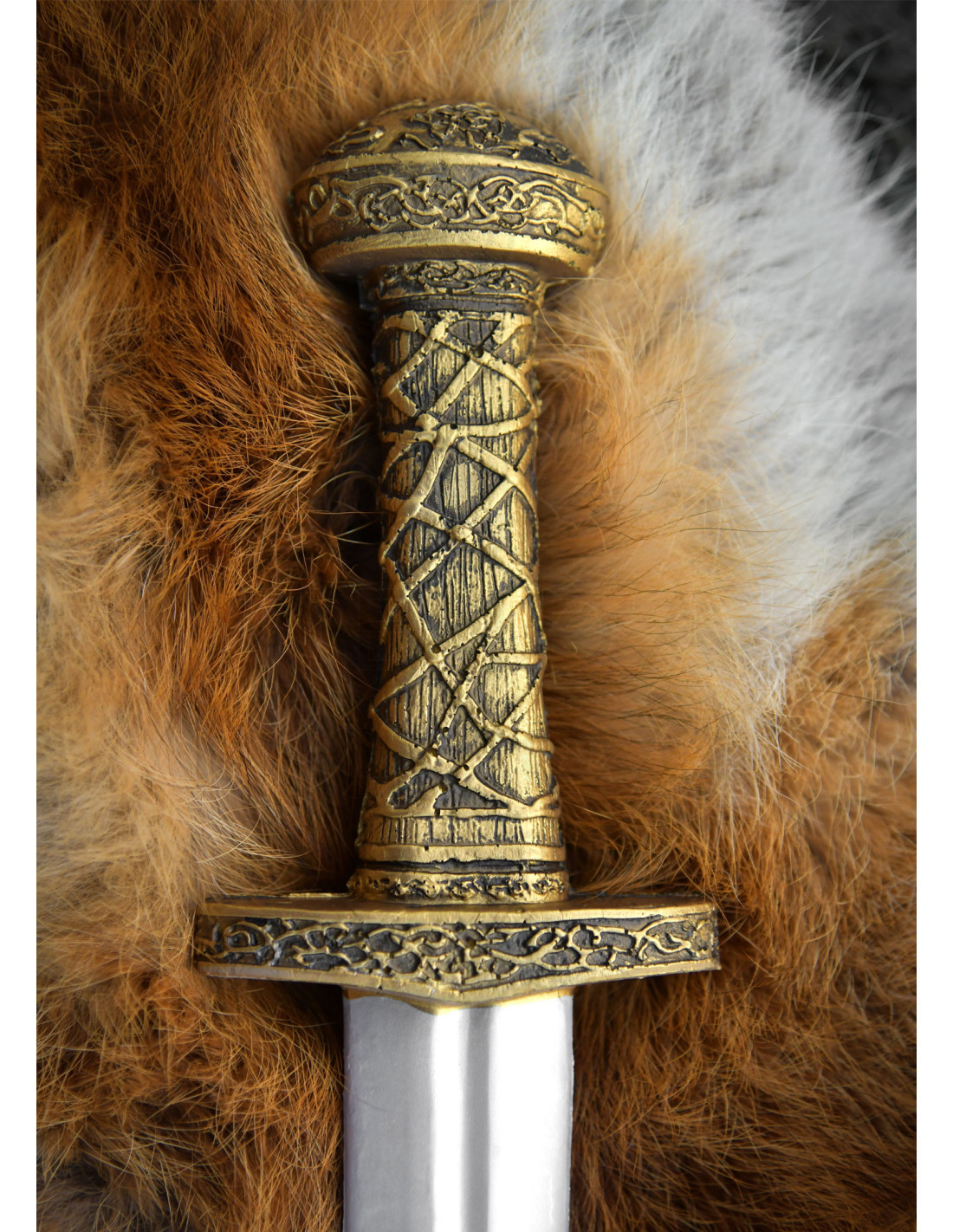 The handle in a golden tone, with reliefs that evoke Nordic and Celtic motifs, transforms a simple grip into a point of pride. This carved texture not only looks authentic, but also facilitates a firm and comfortable hold, ideal for quick and controlled movements. The golden guard and rounded pommel, decorated with engraved patterns, complete a design that conveys authority and tradition.