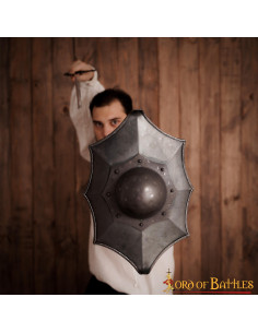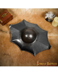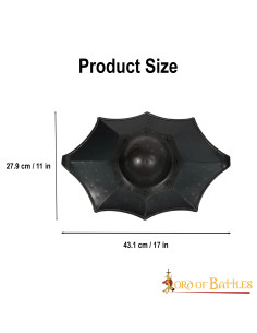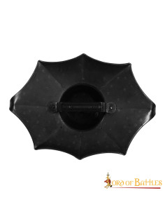 Historical fencing shield Talhoffer Dark Buckler. This shield (17 X 11) inches (with its umbo) is painstakingly handcrafted from 16 gauge mild steel. This shield comes with a reinforced metal handle with a wooden cover for a better grip. The design is historically inspired with meticulous details.