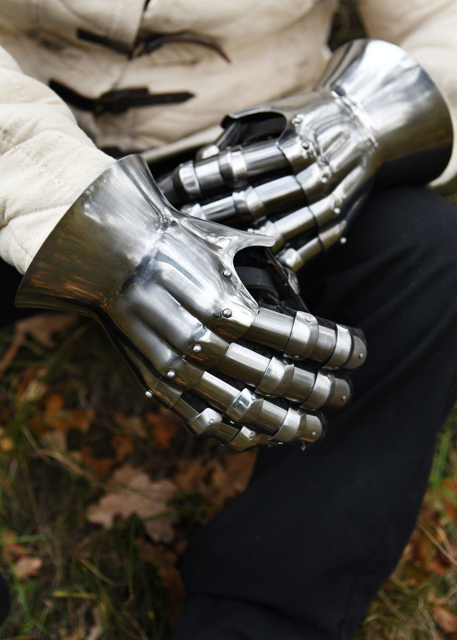 Handcrafted from 1.6 mm (16 ga) steel, these gauntlets feature a robust yet lightweight design. The distinctive 'hourglass' shape not only provides an authentic style but also ensures a comfortable and functional fit. The interior is lined with black suede gloves, guaranteeing comfort, while leather pads on the fingers offer added protection.