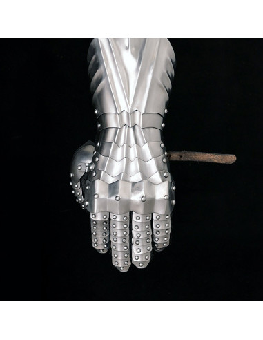 They became leather gloves with an iron circle on the back and others made of mesh that were buttoned on the sleeve. In the fourteenth century, the fingers are separated, up to the middle of the sixteenth to be able to fire the pistol grip. In many tournament armor of the 15th and early 16th centuries, the left hand had a mitten with separate fingers and the right, for the spear, defended by a mitten.