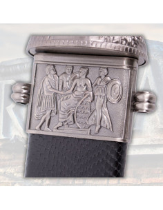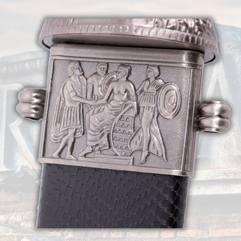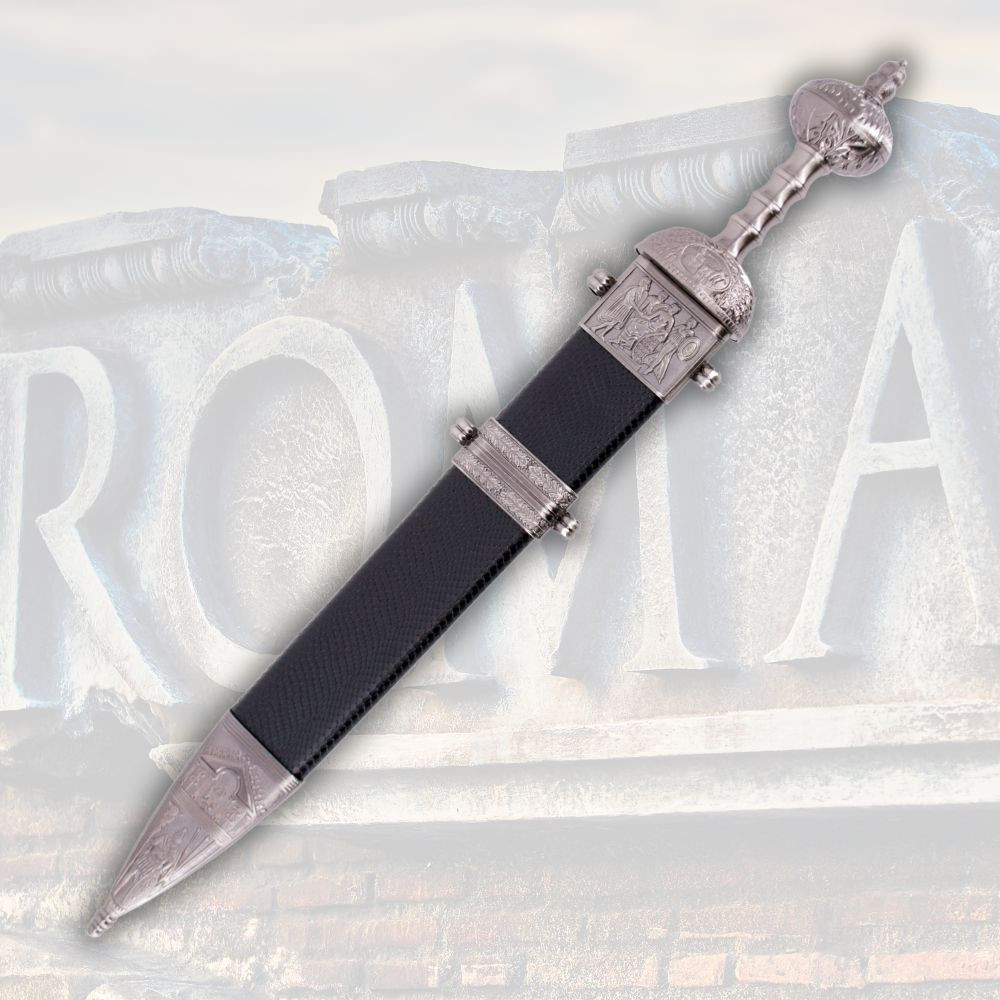 Add to your collection this impressive decorative replica of the classic Roman sword Gladius. With a striking design, this 100 cm sword is finished in nickel, giving it an elegant shine and finish that will not go unnoticed in any display. The steel blade adds robustness and authenticity to the design, while the black sheath with decorative embossed details evokes the aesthetics of ancient Rome.