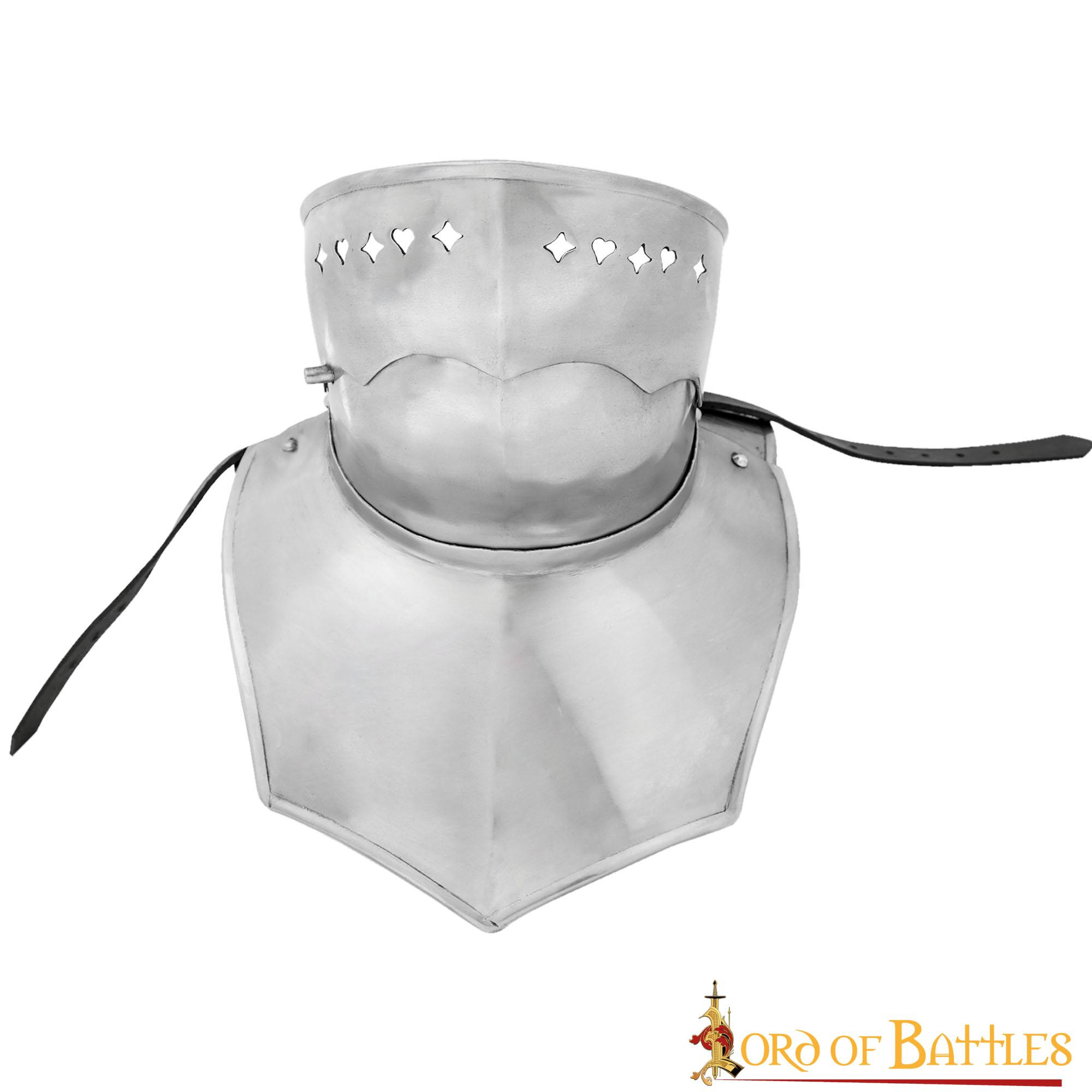 A fully enclosed helmet wouldn't be as efficient as this knight's gorget combined with his trusty helmet! This style was favored by most heavily armored knights from the second quarter of the 15th century until the Renaissance, when the closed helmet was introduced. It allowed the wearer to easily remove the helmet when not needed and provided significant protection on the battlefield.