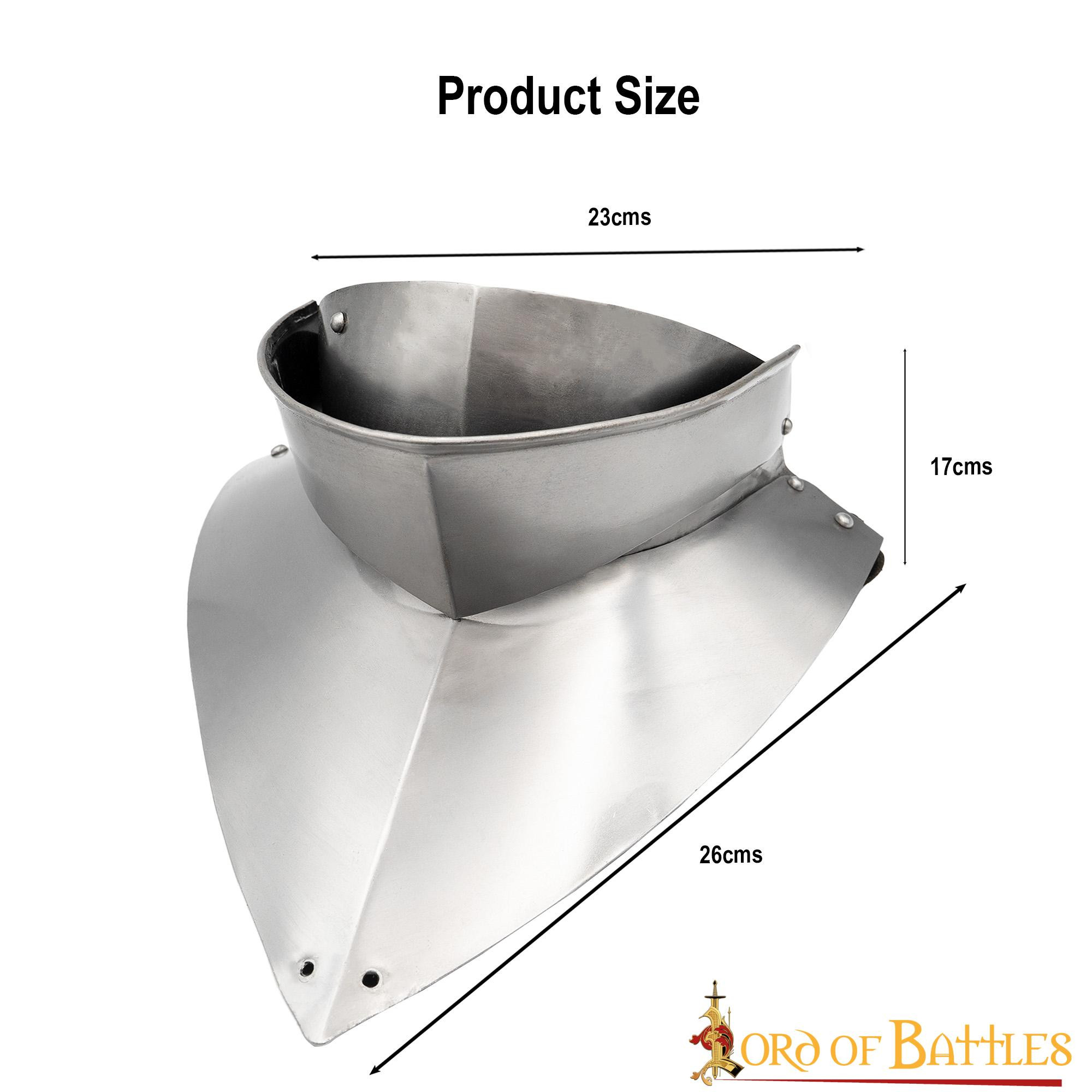 This 15th century medieval gorget with bib is a must-have for any knight or foot soldier looking for reliable throat, bib and upper chest protection. Its historical design and functionality make it an ideal choice for use at historical re-enactments or themed events.