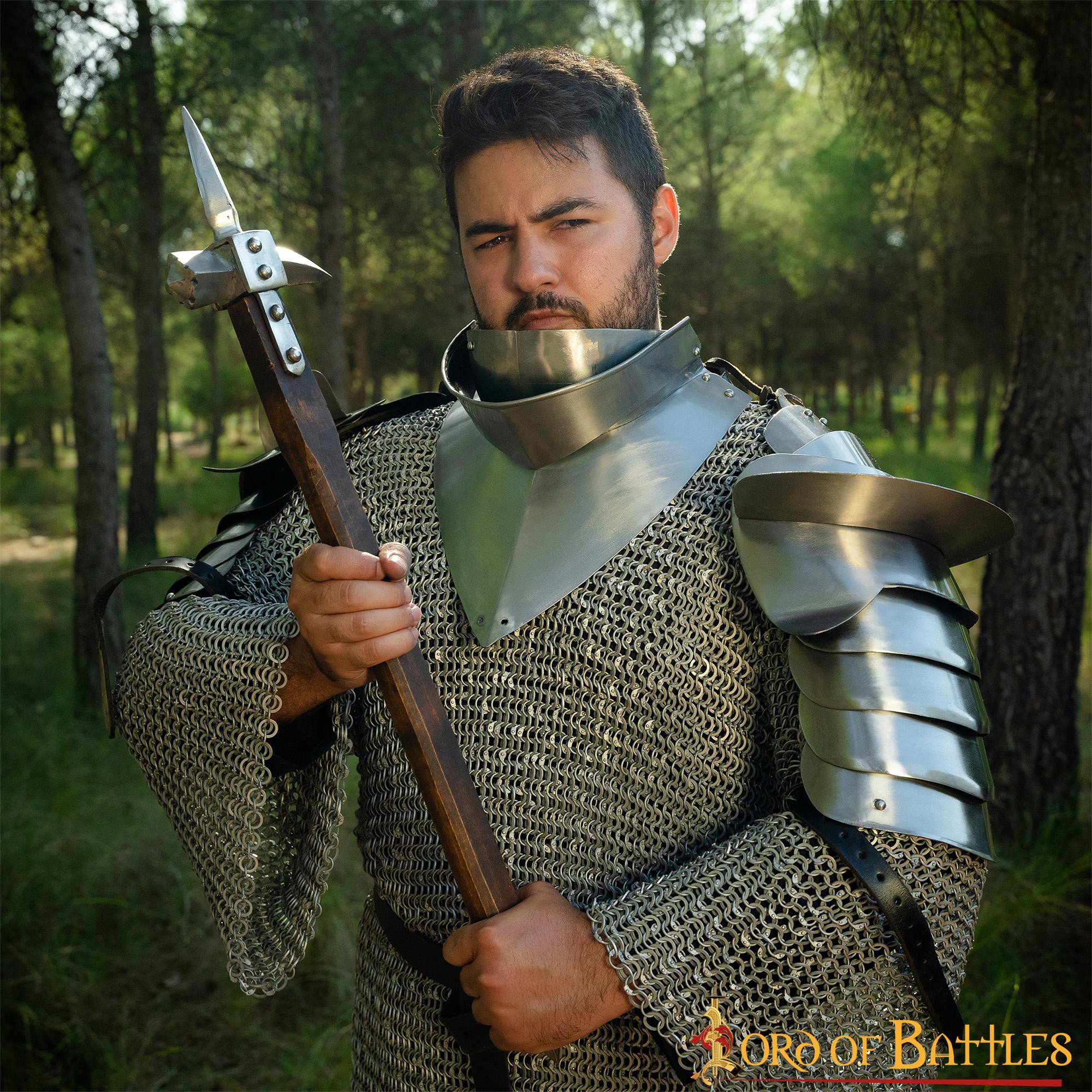 With a one size fits most, this Lord of Battles brand medieval gorget with bib is a safe and reliable choice for any medieval warrior. Its 1G thickness and its steel material provide the necessary resistance to protect the user in any combat situation.