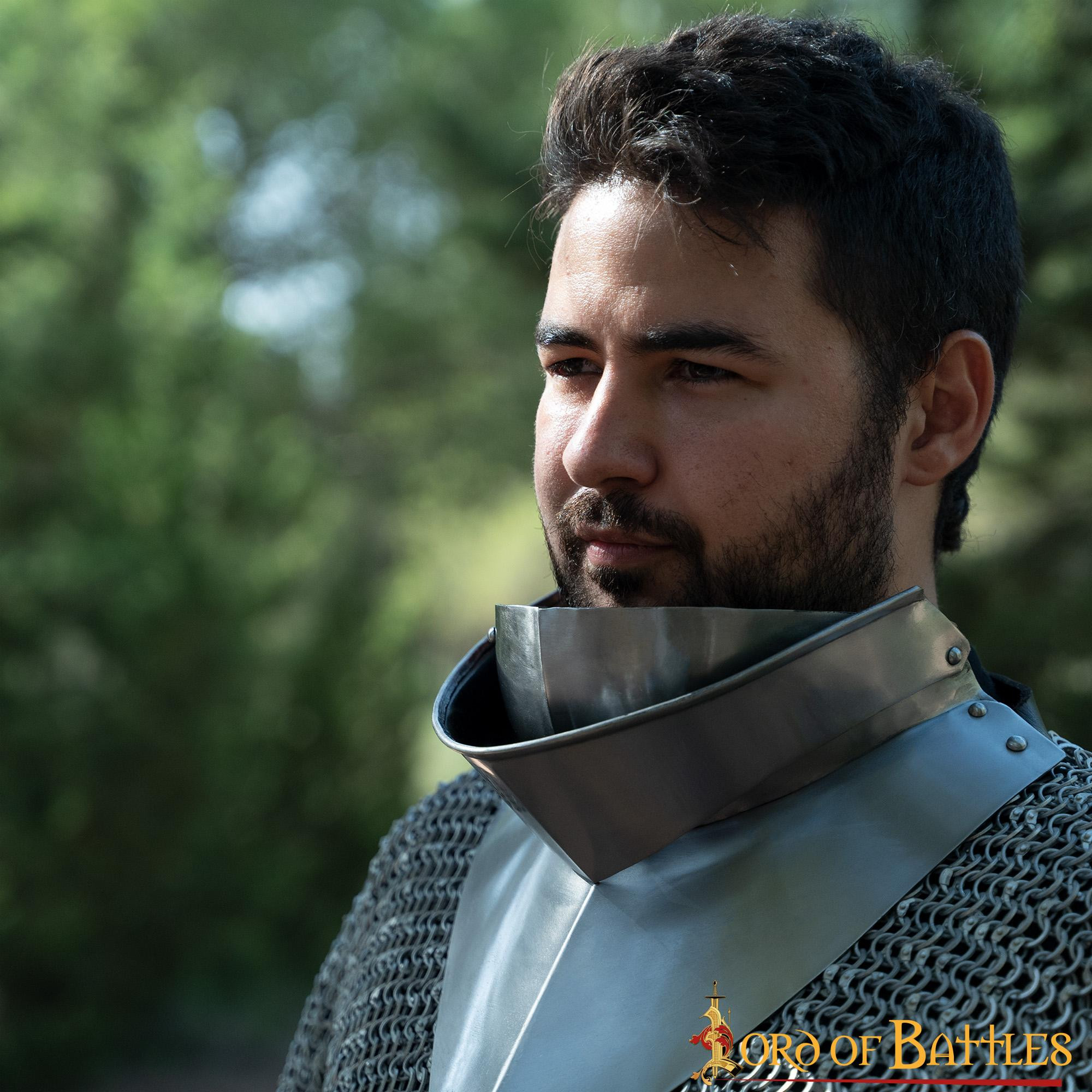 One of the key advantages of this gorget is its versatility. It is compatible with the use of sallets or open face helmets, providing significant additional protection on the battlefield. In addition, the chin plate can be lowered to allow the wearer to catch their breath before returning to action. This adjustment option makes the gorget even more practical and adaptable to the user's needs during combat.