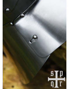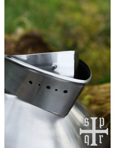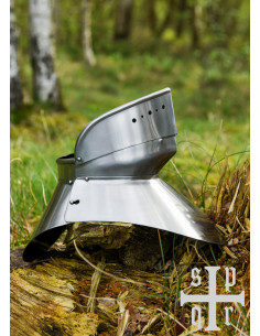 Prepare for battle with the Medieval Steel Gorget for the Late Middle Ages (1.6 mm)! This wearable reconstruction of late medieval plate armor for the throat, chin and neck is made of 1.6 mm (16 gauge) steel and blackened on the inside for better corrosion resistance.