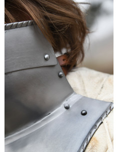 Its adjustable closure with a leather strap and aged bronze buckle guarantees a perfect fit, adapting to different sizes and preferences. The neck protection, while not restrictive, allows you to move freely, making it ideal for medieval reenactments, LARP events, theatrical productions, or cosplay sessions. Additionally, its black finish on the inside helps resist corrosion, ensuring durability and a consistently impeccable appearance.
