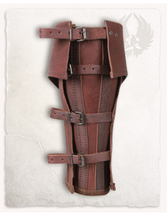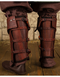 Discover the impressive Randulf model brown leather medieval greaves! Our ""Randulf"" greaves are the ultimate solution for ensuring impeccable-looking, weather-resistant footwear for your LARP and historical reenactment events. The days of cold feet are behind us now that we offer this premium option for modern footwear! These greaves are made up of two parts: first, you close the rear part over your calf, if necessary, with a leather strap. Then, you close the front with four fastening buckles each.