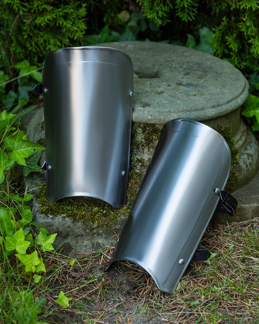 These greaves, similar to our popular 'Adam' greaves, are made from strong 1mm steel, ensuring maximum protection for your legs. They close securely with two buckle straps on the back, making them easy to put on and take off. Also, if you need to adjust them to fit your legs perfectly, you can carefully fold them.
