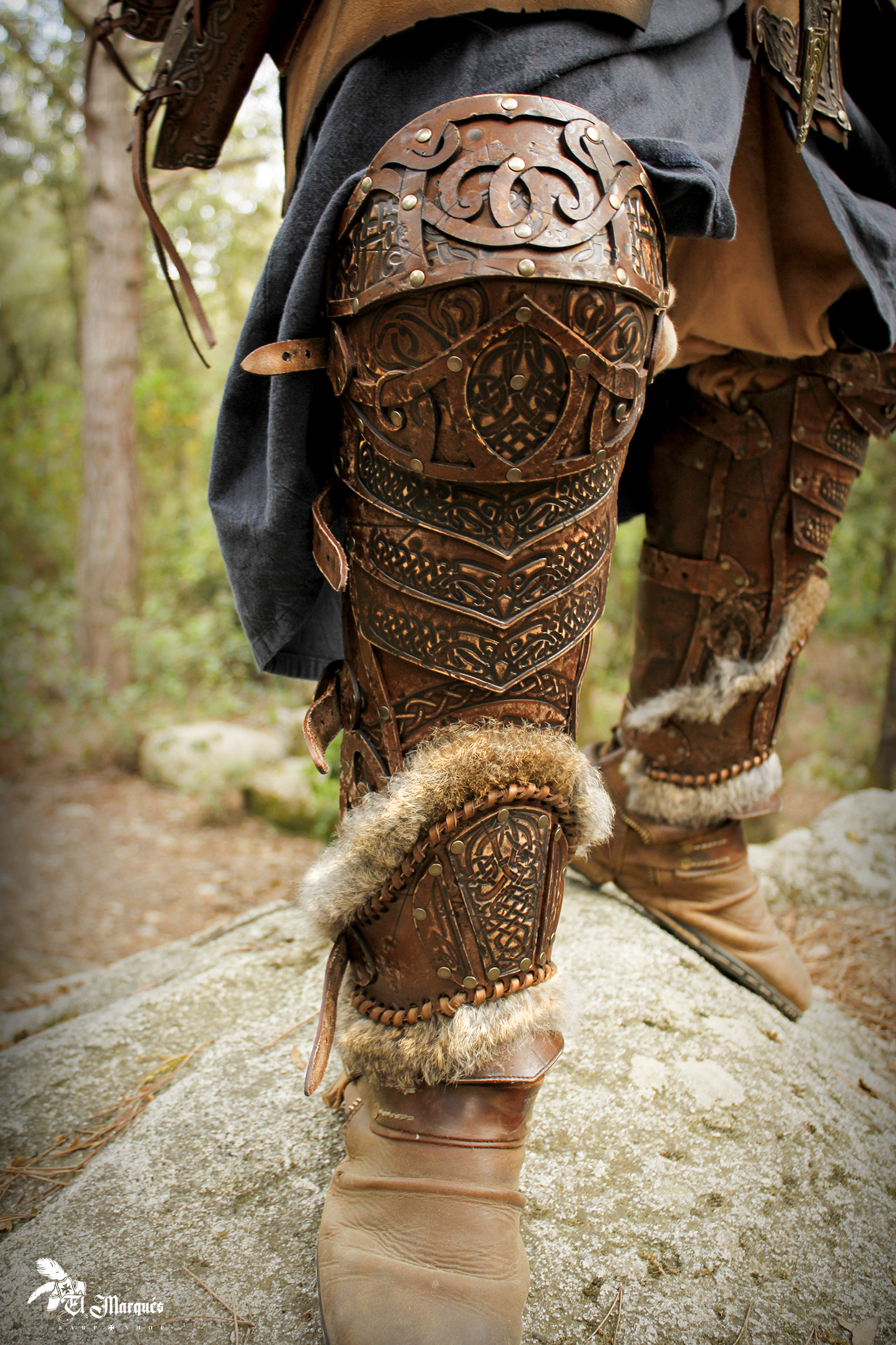 Made from high-quality Spanish leather, these greaves offer a perfect combination of durability and comfort. Their ergonomic design protects the knee and the back of the leg without sacrificing freedom of movement. The embossed engravings with Celtic and Viking knot motifs, along with the worn textures that simulate years of battle, provide a unique and authentic aesthetic. Additionally, the adjustable straps with brass buckles ensure a secure fit, while the touch of real rabbit fur accentuates that genuine and rustic detail.