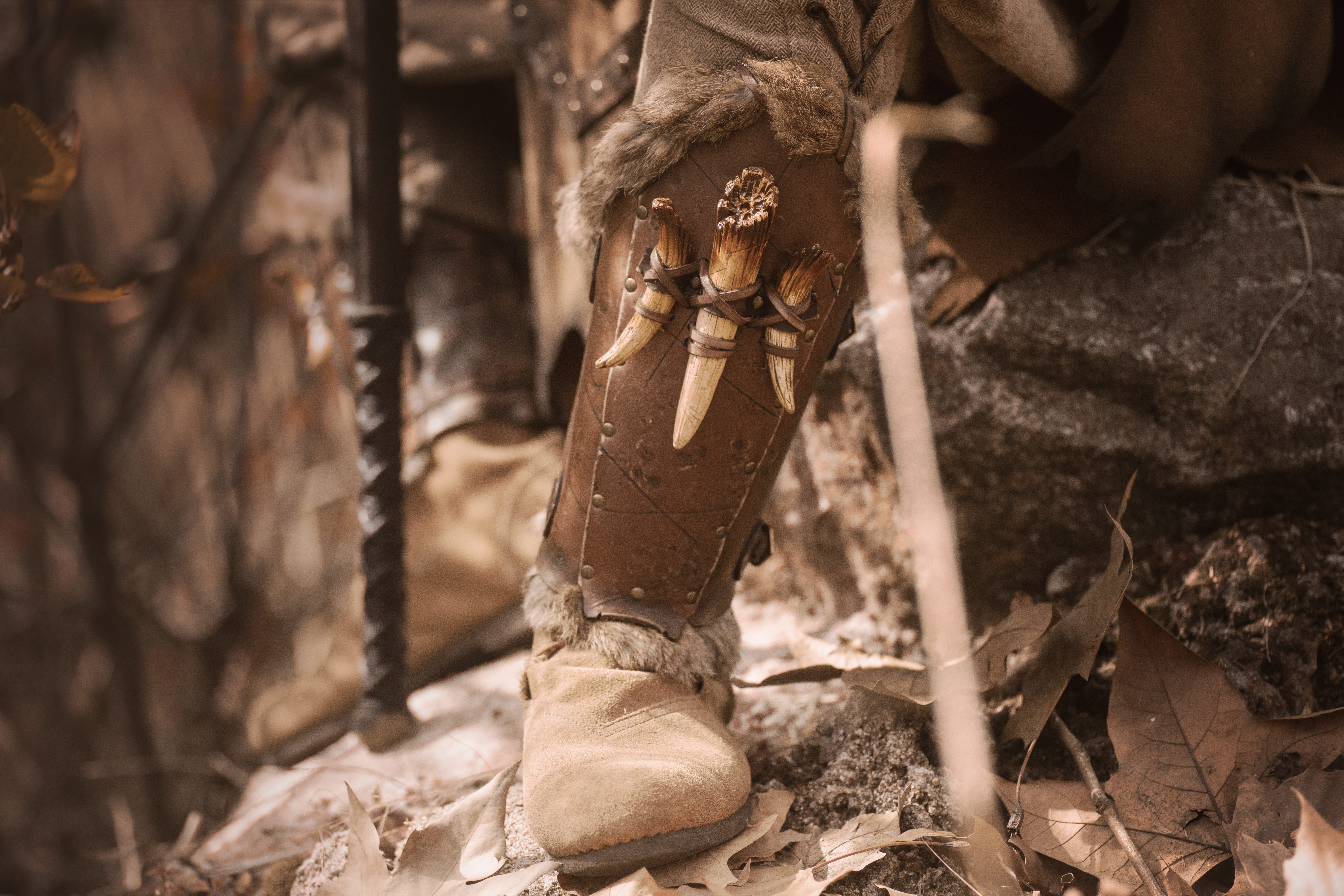 With optimal thickness and a comfortable cut, these greaves do not restrict your movement, allowing you to run, fight, or march with style and confidence. They are adorned with natural hair, meticulously placed, and three LARP safe rubber fangs, designed to withstand impacts while maintaining a realistic finish. Their handmade dyeing, available in brown or black tones, highlights the artisanal qualities of the product.