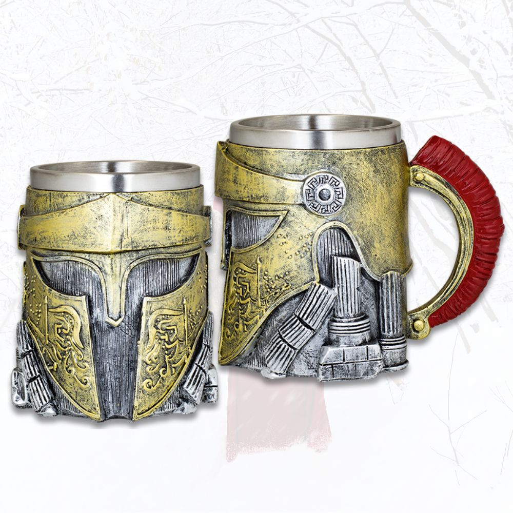 The 360° raised decoration, with predominant gold and silver colors, along with the red details on the handle, make it particularly eye-catching. The handle, reminiscent of a Spartan helmet crest, is not only an exceptional visual detail but also ergonomic and comfortable to hold. Its metallic interior adds practicality, making it ideal for enjoying both cold and hot beverages, while always preserving its thematic spirit.