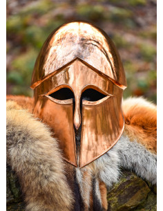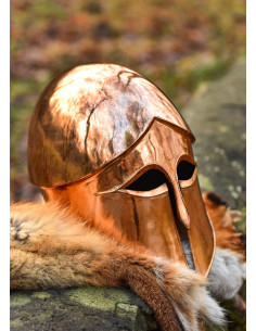 Hand-forged in solid bronze, its design envelops your head with an ergonomic shape that combines protection and style. The visor, with carefully carved openings, allows for clear vision without sacrificing safety, while its artistic details on the forehead reflect the craftsmanship and care behind each piece. The finish in golden tones with a slightly rustic touch enhances its authentic appearance, reminiscent of ancient blacksmith workshops.