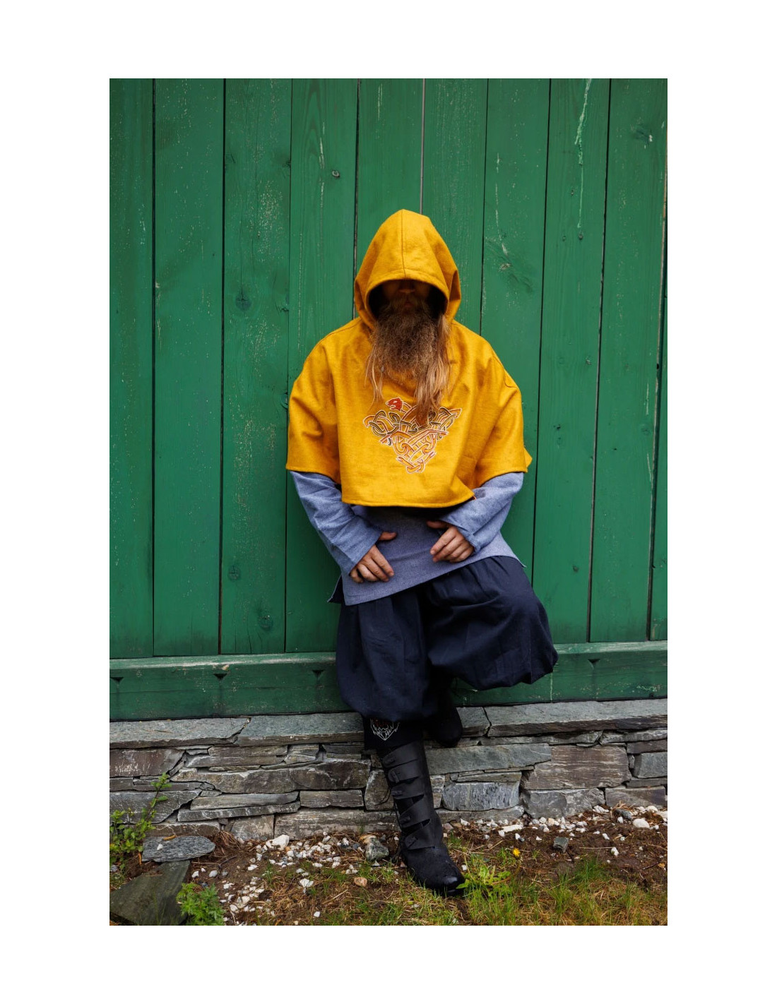 Gugel Viking in Wool Bjomolf model available in mustard yellow. This gugel is perfect for those looking for a unique and original style. With its large collar and hand embroidery, this gugel will make you stand out at any occasion.