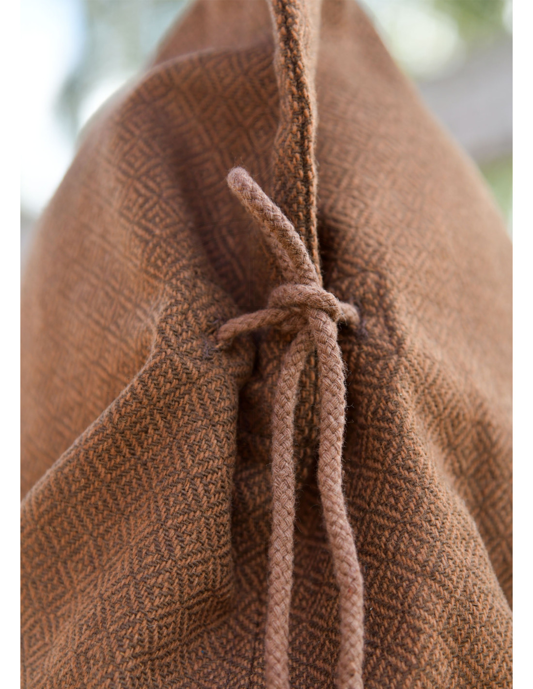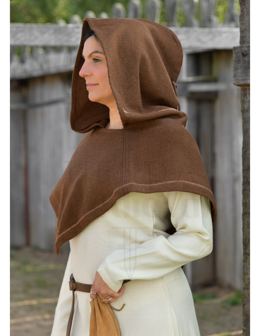 This brown wool hood transforms that idea into reality, offering natural comfort that protects you from the wind while maintaining a silhouette true to ancient times. The herringbone fabric with small diamonds adds a visible texture that enriches any tunic or cloak, while the contrasting trim enhances the contours with an elegant finish, perfect for those seeking authenticity without sacrificing style.