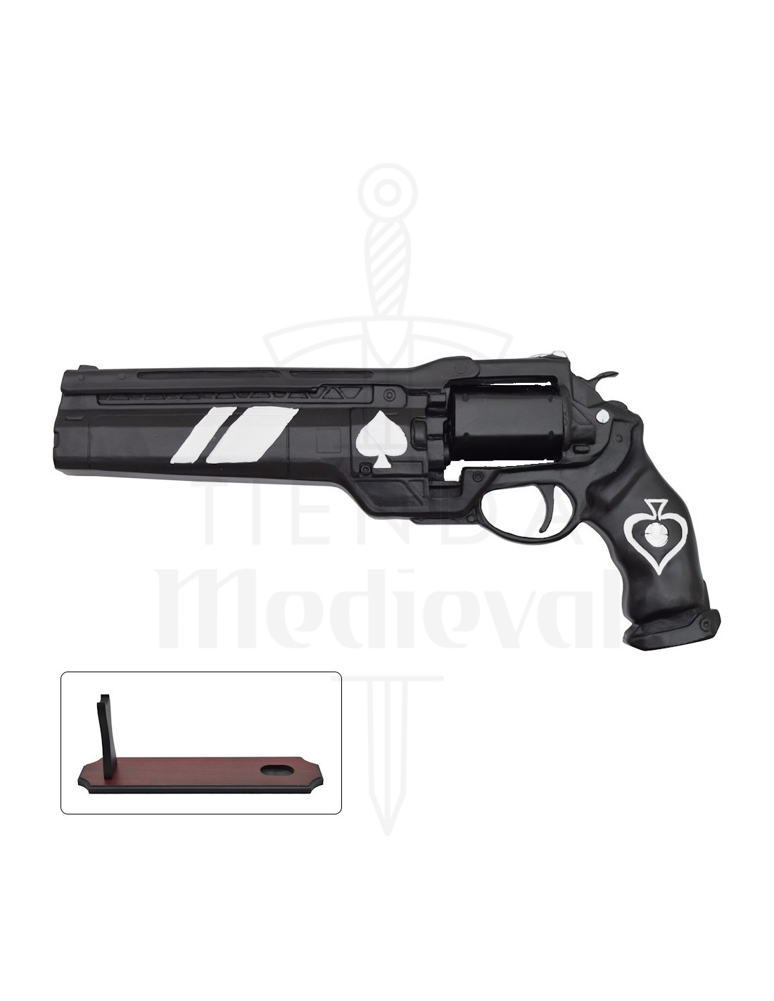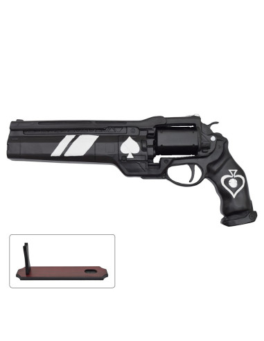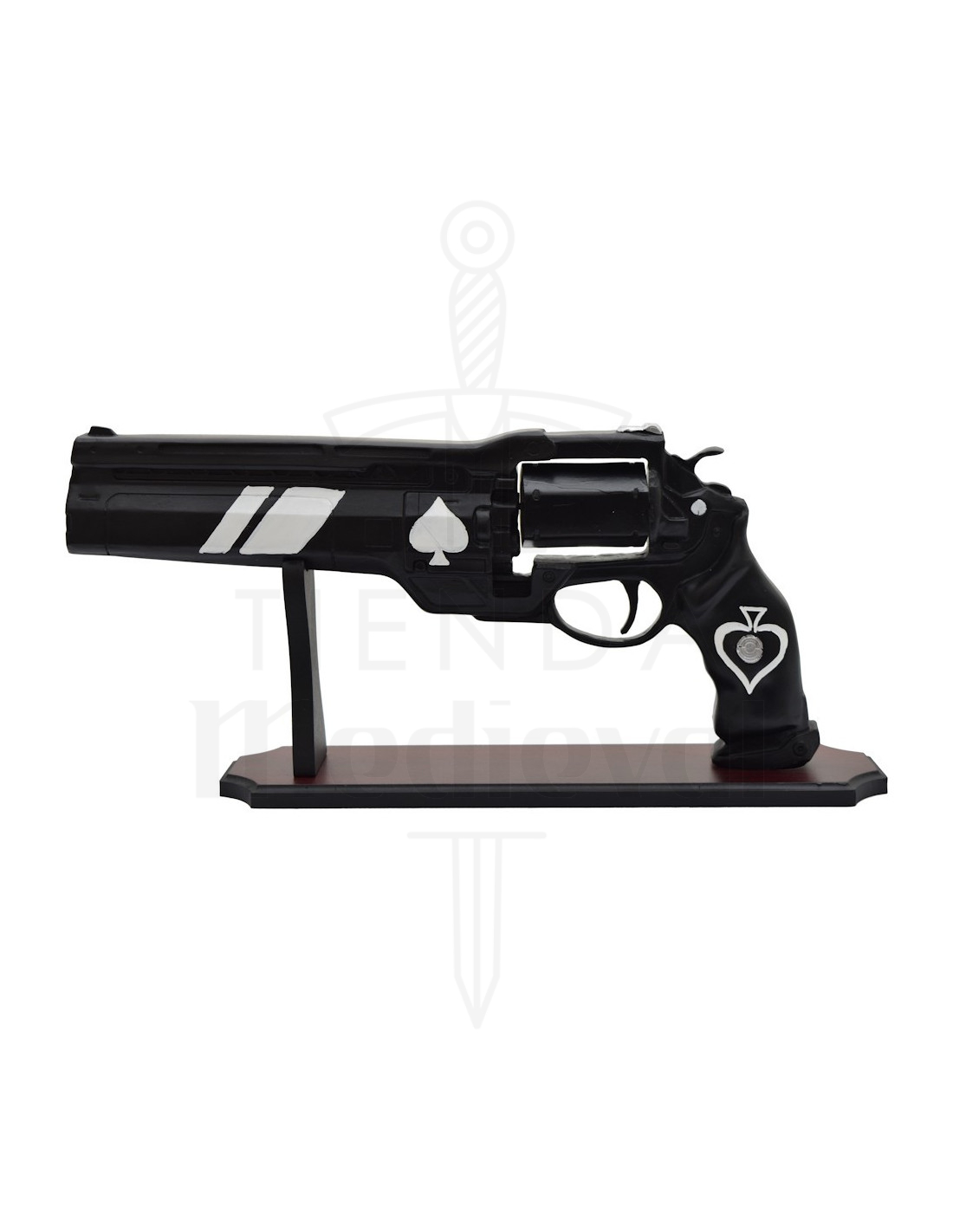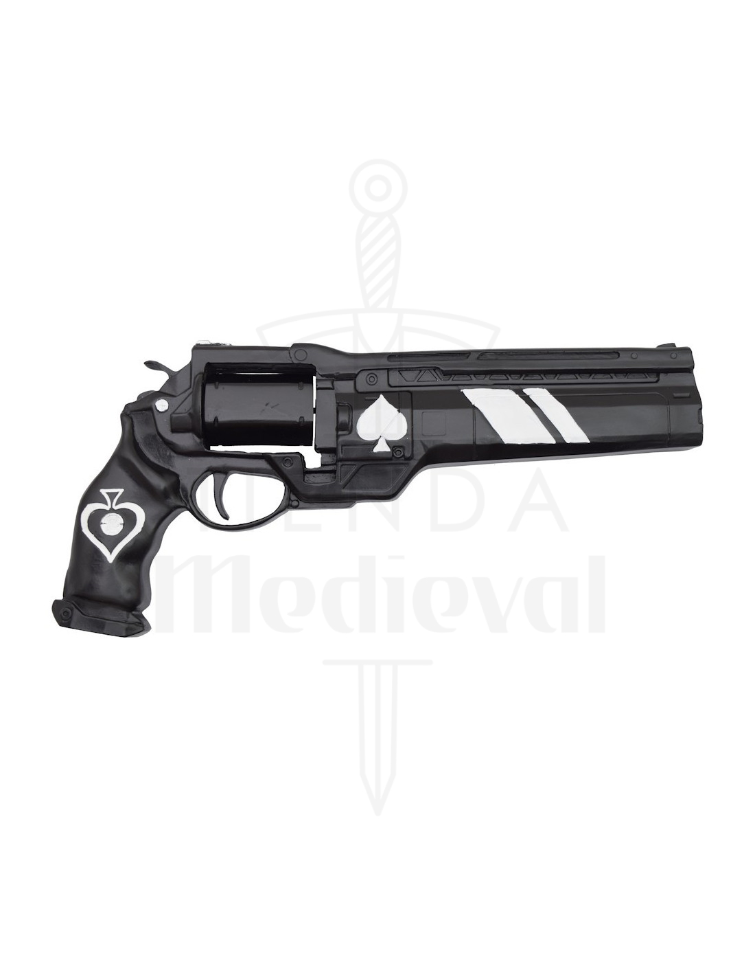 This ornamental piece recreates the spirit of the famous fantasy revolver, with a deep black finish and white painted details that highlight the spade card symbol and the small emblem on the handle, like a crowned flame, giving it character and personality. The cylinder, trigger, and hammer are sculpted to preserve the classic aesthetic of the design, while the overall appearance maintains the safety and tranquility of a non-functional replica, ideal for display on shelves, walls, or themed corners.