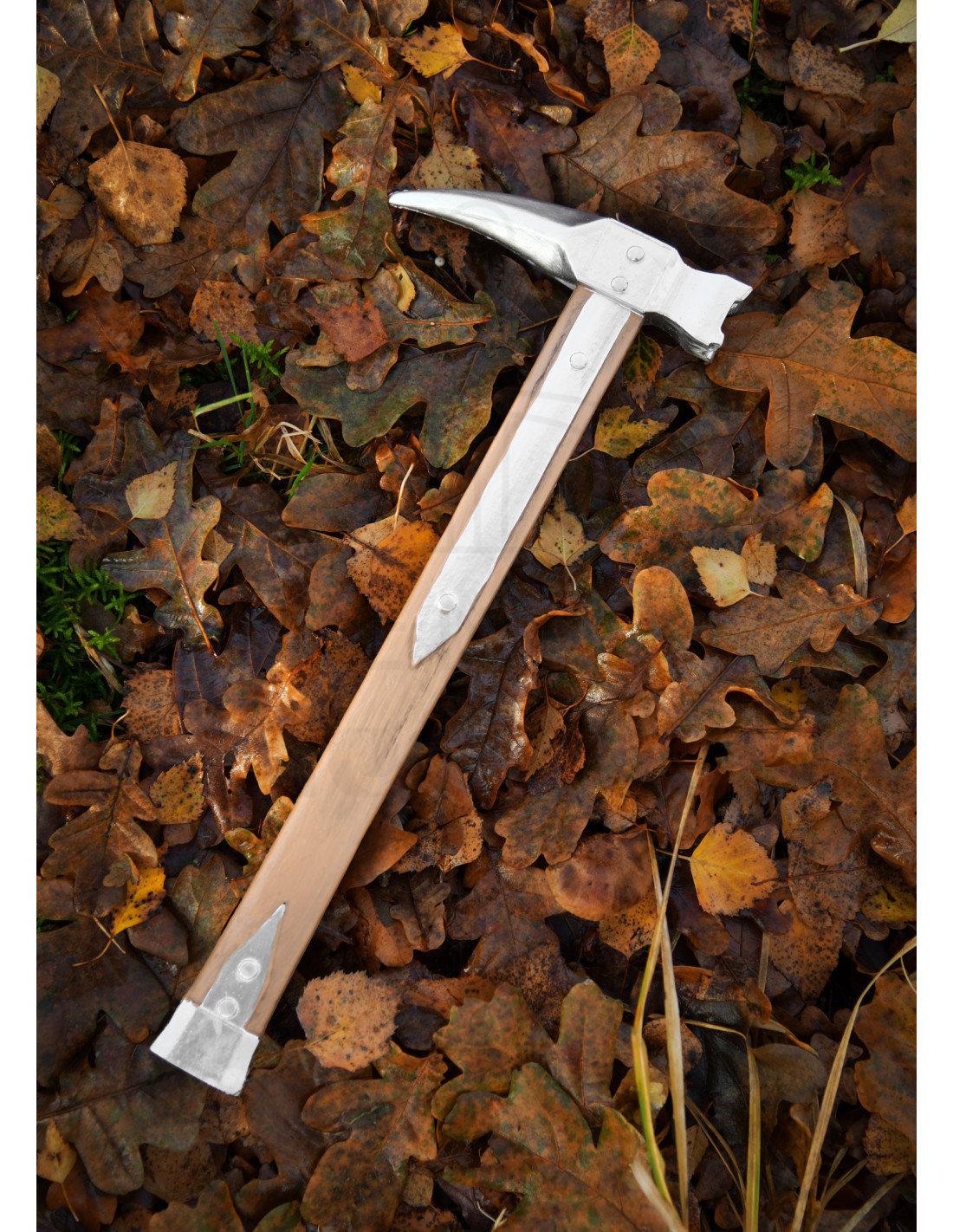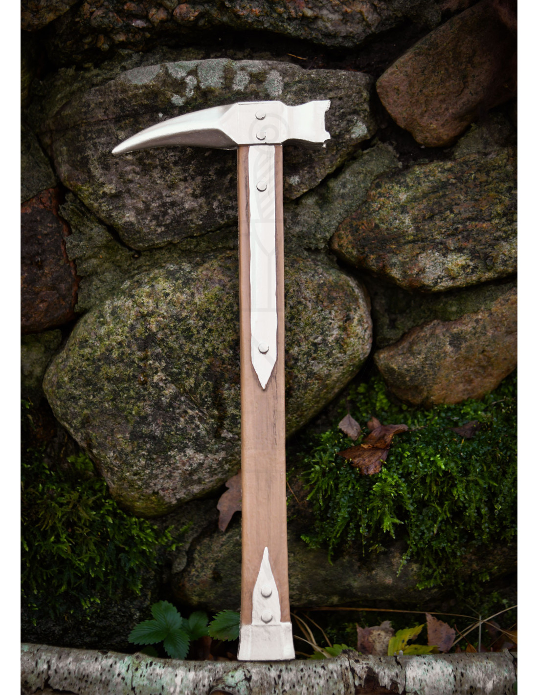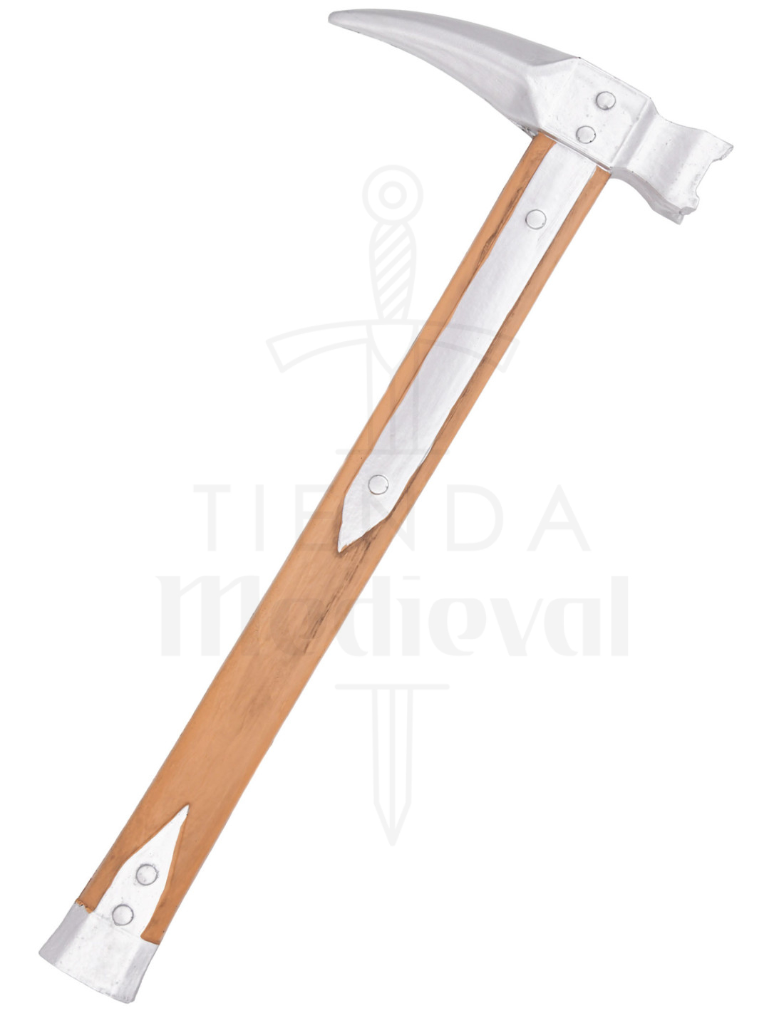 The handle, with grains that simulate light wood and metallic reinforcements riveted at strategic points, not only adds the aesthetic of a seasoned warrior but also provides a secure grip and a feeling of resilience. It is a robust companion, ideal for transforming backyards, toy castles, or sets into fields of honor.