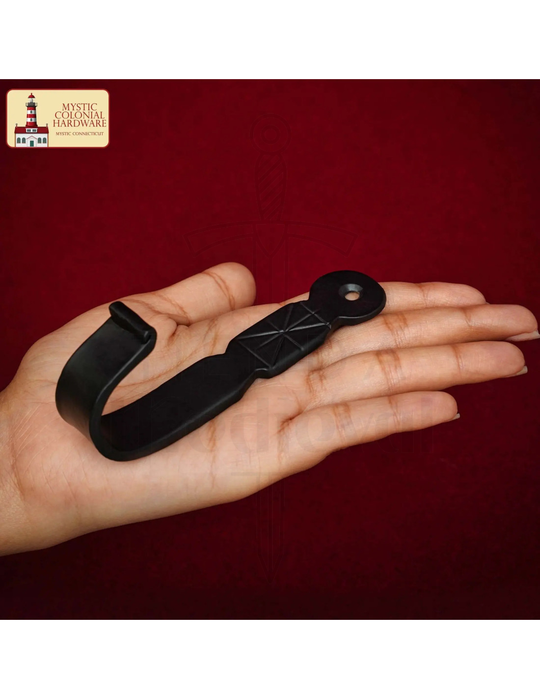 Versatile in use, it is perfect for hanging coats, bags, keys, hats, and bathrobes, and its black aesthetic adapts to both rustic interiors and modern environments seeking an industrial contrast. The wooden background in the image is only a visual support; the focus is on the metal and its handcrafted craftsmanship.