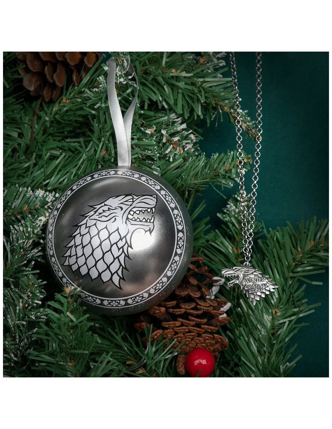 This piece, Legacy of Winterfell - Limited Edition Holiday Capsule, captures the spirit of House Stark in a design that speaks subtly. The medallion featuring the head of the direwolf, sculpted in relief with visible teeth and a texture reminiscent of fur, instantly conveys character and presence, while the semi-matte metallic finish provides a refined appearance that does not lose its resilient nature.
