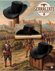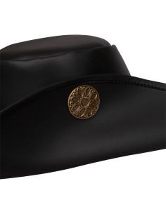 The medieval leather hat model Flanders in black color is a handcrafted Spanish piece that stands out for its robust design and classic style. Made from high-quality leather, this hat is perfect for those seeking an accessory that evokes the essence of musketeers, pirates, and adventurers, adding authenticity to any historical or fantasy outfit. Its wide brim, adorned with a melted coin securing the edge, is a distinctive detail that enhances its refined character.