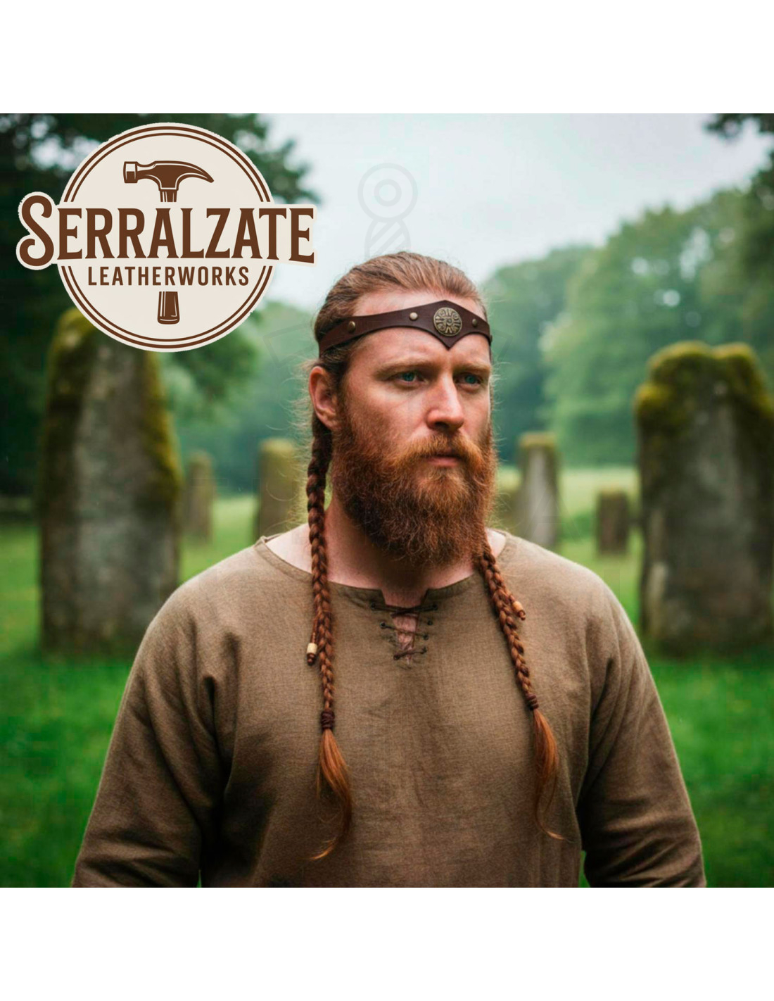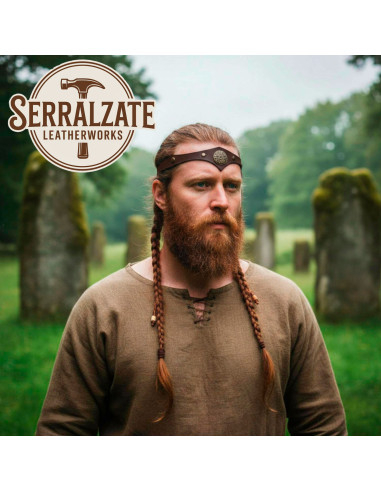 Its design protects the forehead with the delicate elegance provided by the metal ornament with Celtic motifs and rivets, highlighting details that reflect history and tradition, ideal for people who enjoy accessories with character and spirit. The adjustable strap at the back, made of leather cord, ensures perfect comfort and a personalized fit, making it suitable for various occasions.