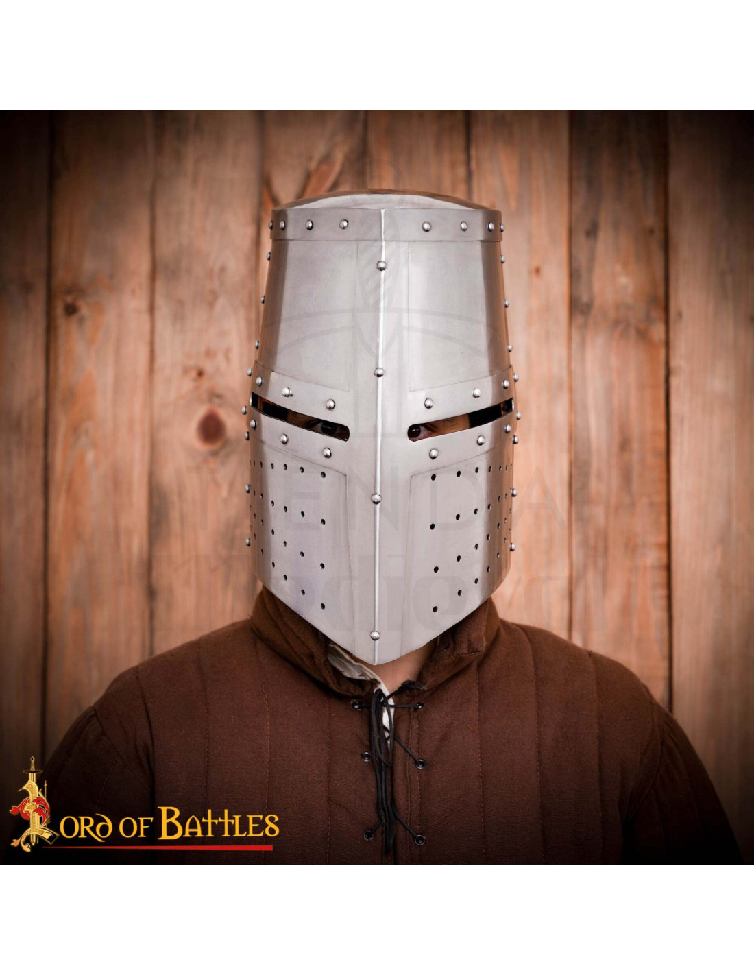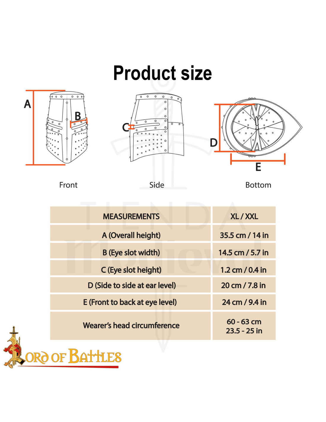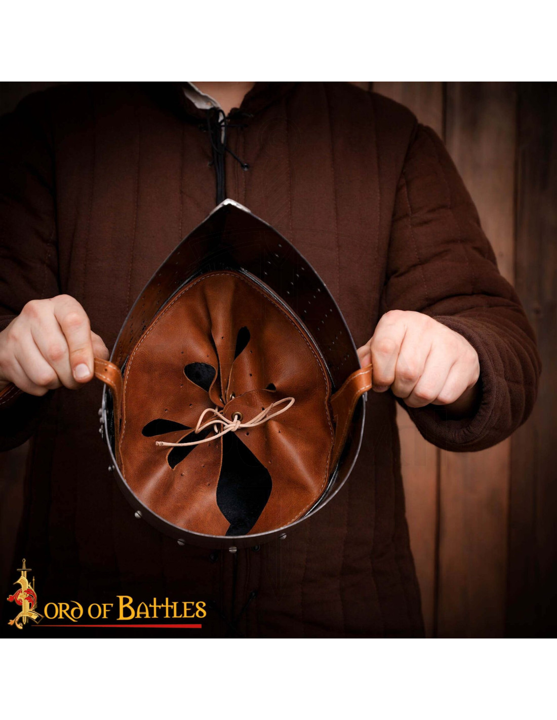 Its design inspired by the 13th and 14th centuries fully covers the head, with a structure that allows clear vision through its wide eye slits, over 14 cm long, and ventilation through perforations that facilitate comfort during use. Thanks to its leather lining, it fits perfectly to your head, providing comfort and absorbing blows in combat, as well as aiding in proper vision alignment.