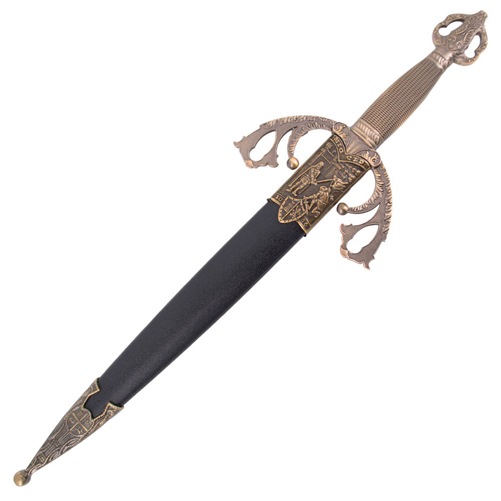 Delve into the exploits of the brave Cid Campeador with the medieval Dagger Tizona del Cid, a masterpiece of elegance and power that evokes the greatness of this legendary Spanish warrior. With its bronze finish and exquisite details, this dagger is a gem for any collector or medieval history enthusiast.