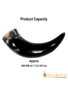 This drinking horn has a total capacity of approximately 400-500 ml, perfect for serving a refreshing drink with up to 20% alcohol content. Remember to avoid using it in the dishwasher and with hot drinks. Before its first use, be sure to wash it under running water. In addition, to guarantee its durability and beauty, we recommend treating it with beeswax after each use.