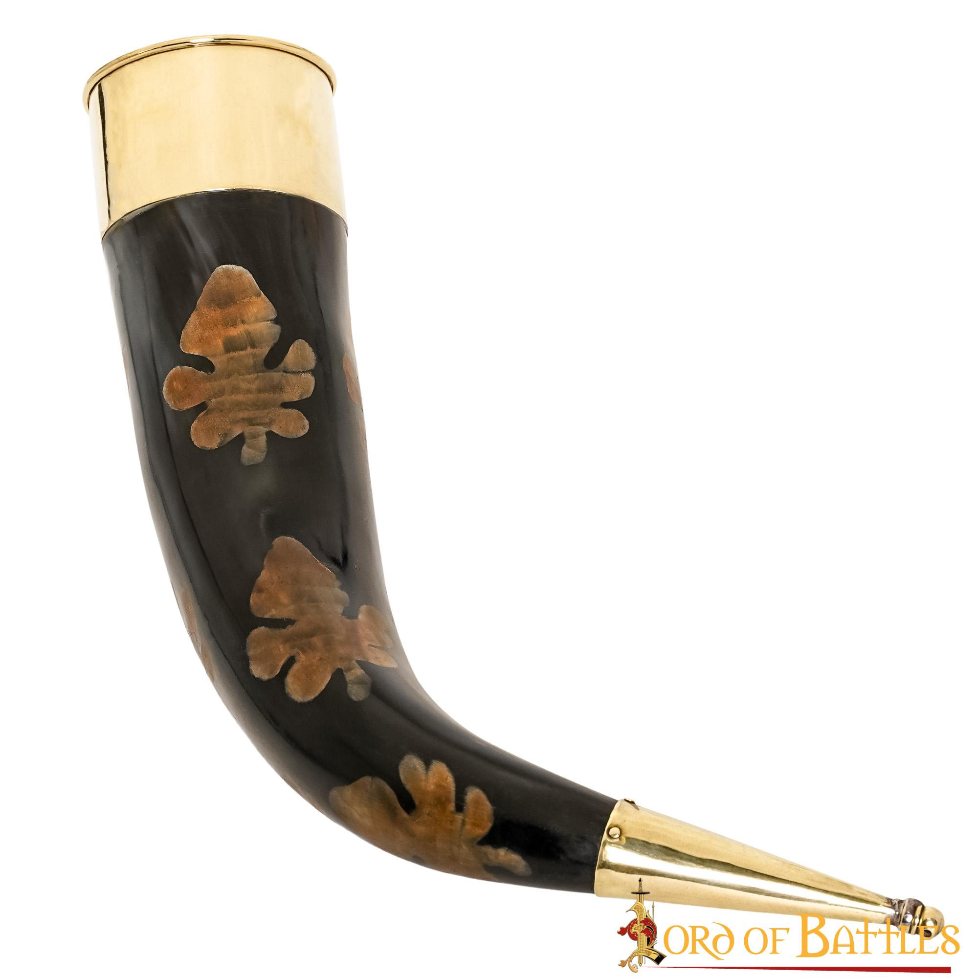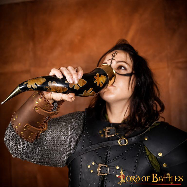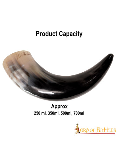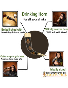 Thanks to its capacity of approximately 300-400 ml, you will be able to enjoy your favorite drinks, whether it is a cold beer with your friends in a casual meeting or a delicious mead during a special evening. Additionally, the horn is designed with carbonized flecks and ornate brass fittings, making it a visually appealing and elegant item that is sure to catch the eye of all your guests.