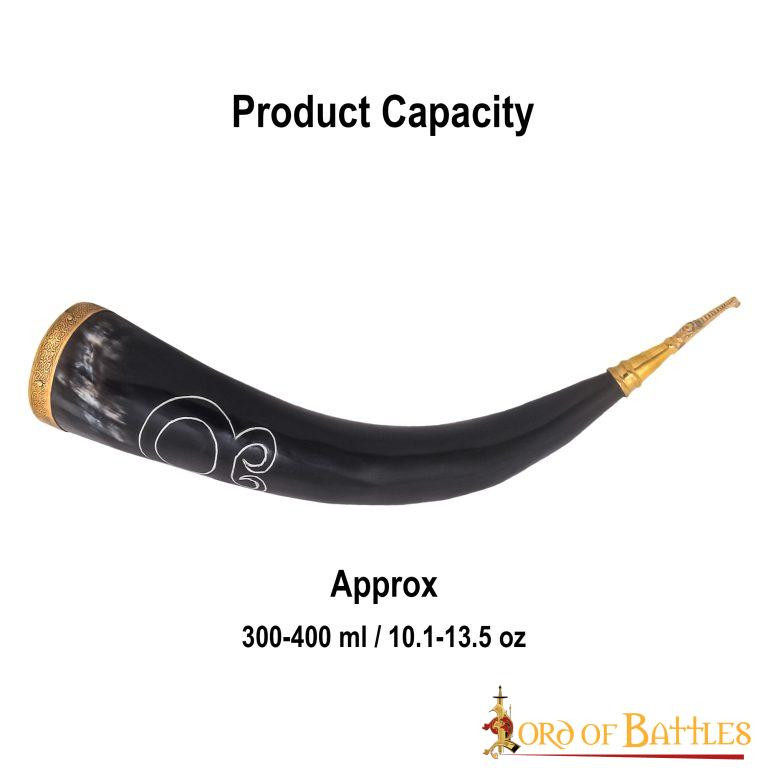 We present the Viking Drinking Horn Cruz Troll model, an authentic artisan jewel made with BOVINE HORN OF ETHICAL ORIGIN. This impressive horn has a perfect capacity of approximately 300-400 ml, ideal for enjoying any liquid with up to 20% alcohol content.