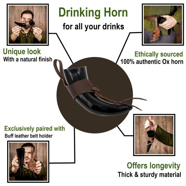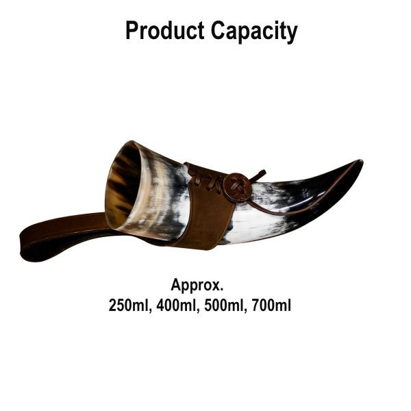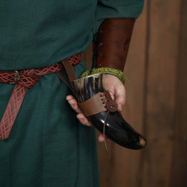 Discover the Viking drinking horn with leather baldric, the perfect accessory for lovers of Viking history and culture. This drinking horn has been meticulously handcrafted from a genuine ox horn, giving it an authenticity like no other.