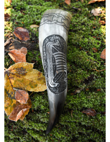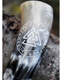 The drinking horn we offer here is handcrafted from cattle horn, polished and embellished with an engraved Valknut symbol framed by a sequence of runes.