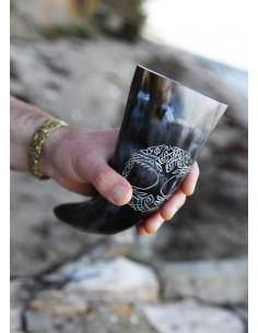 The drinking horn we offer here is handmade from cattle horn, polished and embellished with an engraved motif of Yggdrasil, the world tree or tree of life. In Norse mythology, the evergreen ash Yggdrasil is the axis of the world connecting the heavens, the earth, and the underworld. As the embodiment of the entire cosmos or all of creation, this sacred tree symbolizes knowledge, life, decay, renewal, and ultimately immortality.