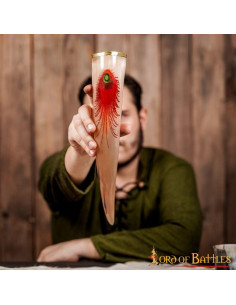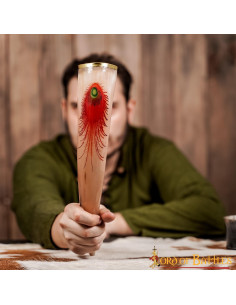 This drinking horn features an intricately hand-painted peacock feather. It is named after Olaf the Peacock, head of the primitive Icelandic community. A peacock feather has been hand painted on the horn and stamped for durability.
